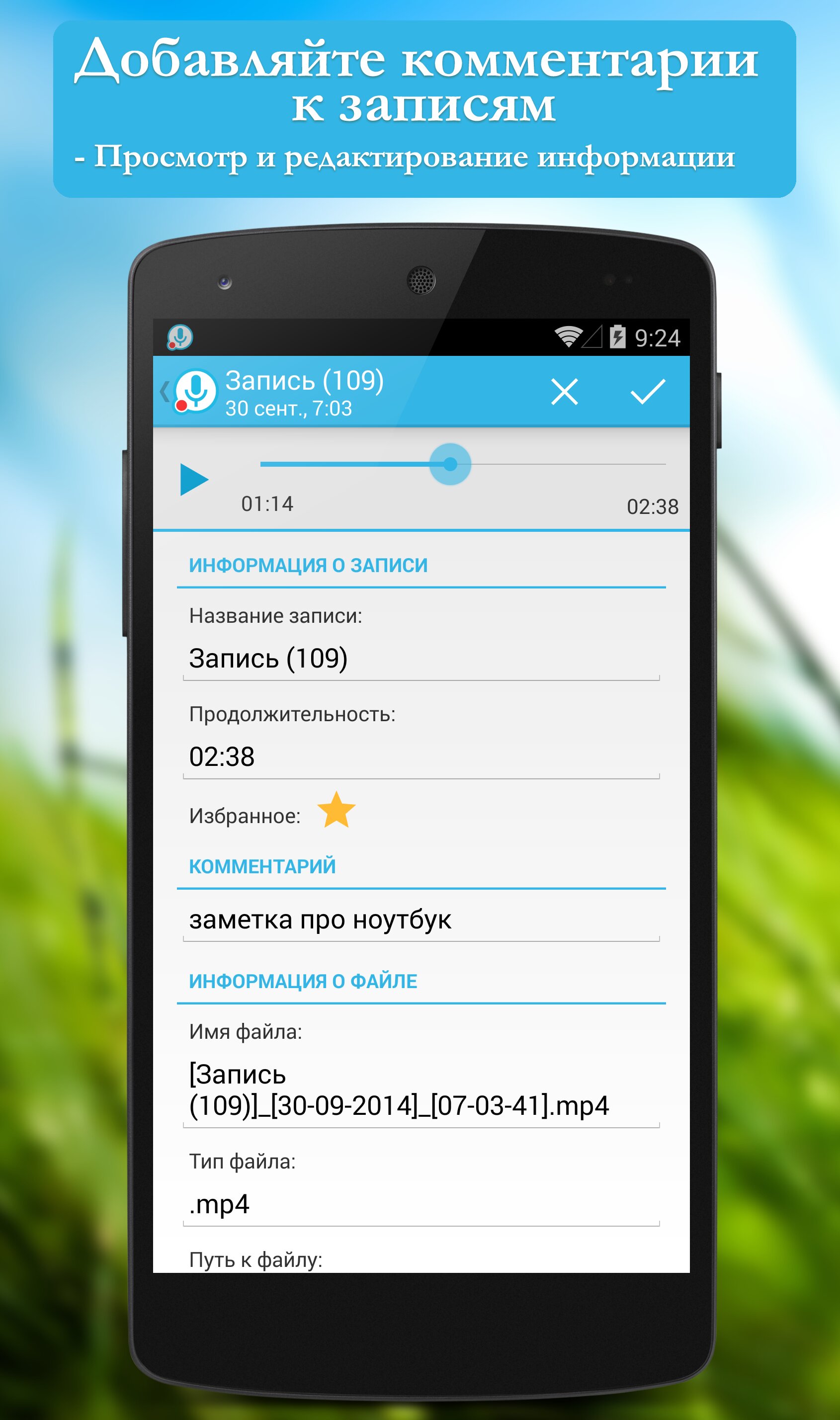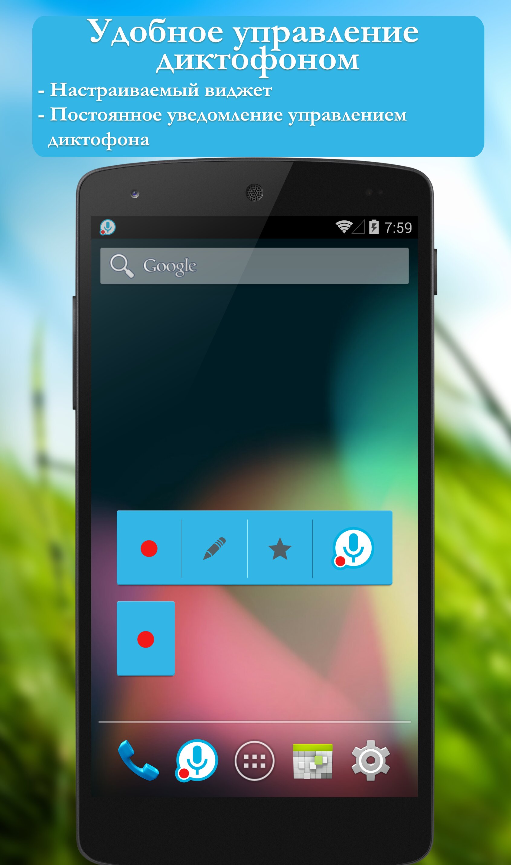 • Настраиваемый виджет (Запись/стоп, Добавить комментарий, Добавить в избранное, Открыть приложение)