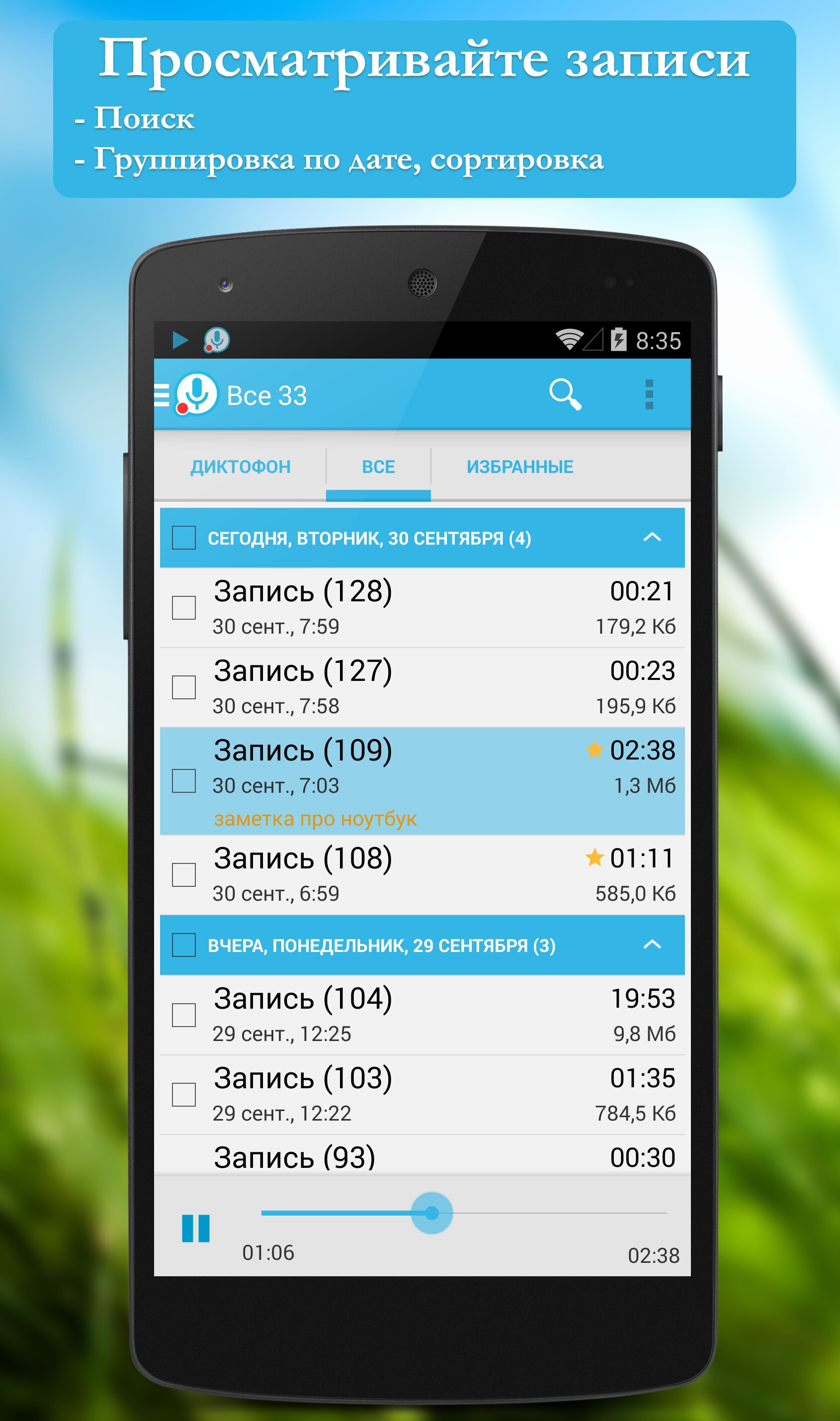 • Постоянное уведомление управлением диктофона (Запись / стоп, Добавить комментарий, Добавить в избранное) — быстрый доступ к диктофону (ОЧЕНЬ УДОБНО!) (Только в полной версии приложения)
