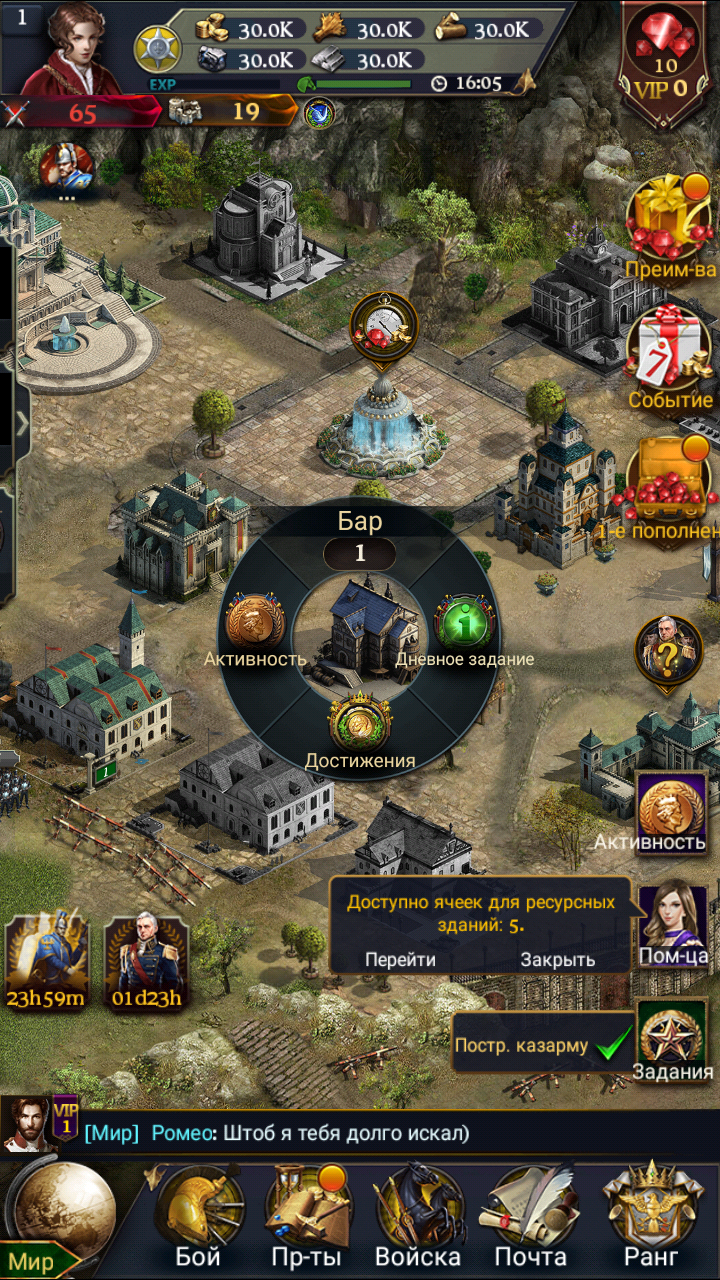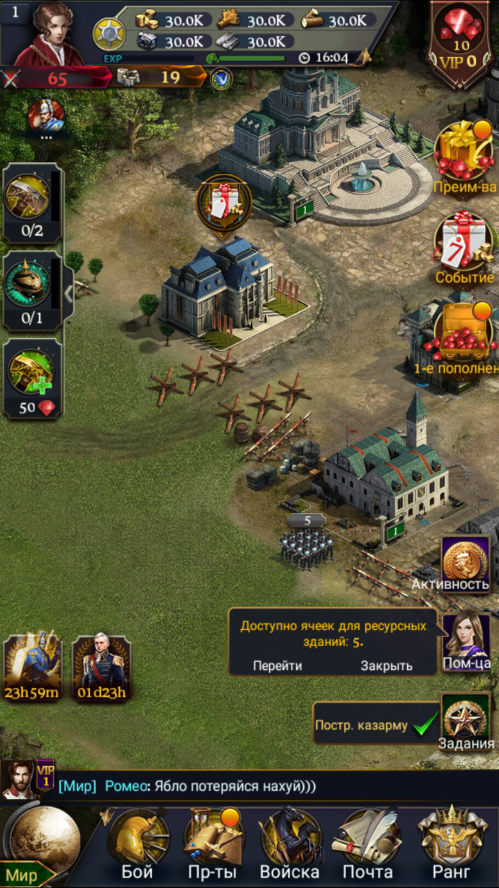 Собирай армию и ресурсы, создавай оружие и броню, побуди в этой войне. Построй свой город, в которой будет жить твои люди и защищай его как зеницу ока. Подниметесь от обычного солдата до генерала. Построив свой город, вы увеличите создании ресурсов и объемы хранилищ. Ведь ваших солдат надо кормить, а так создавать для них оружие, а значит надо построить кузницу. Повышайте военную мощь строя разнообразны здания, которые помогут вам победить в войне. Чтобы ваша армия выиграла, вам необходимо знать слабые места своего врага, а также использовать знания о рельефе местности. В нашей игре есть огромный открытый мир, в котором играют более миллиона настоящих игроков. Боритесь с иными и захватывайте их территории.