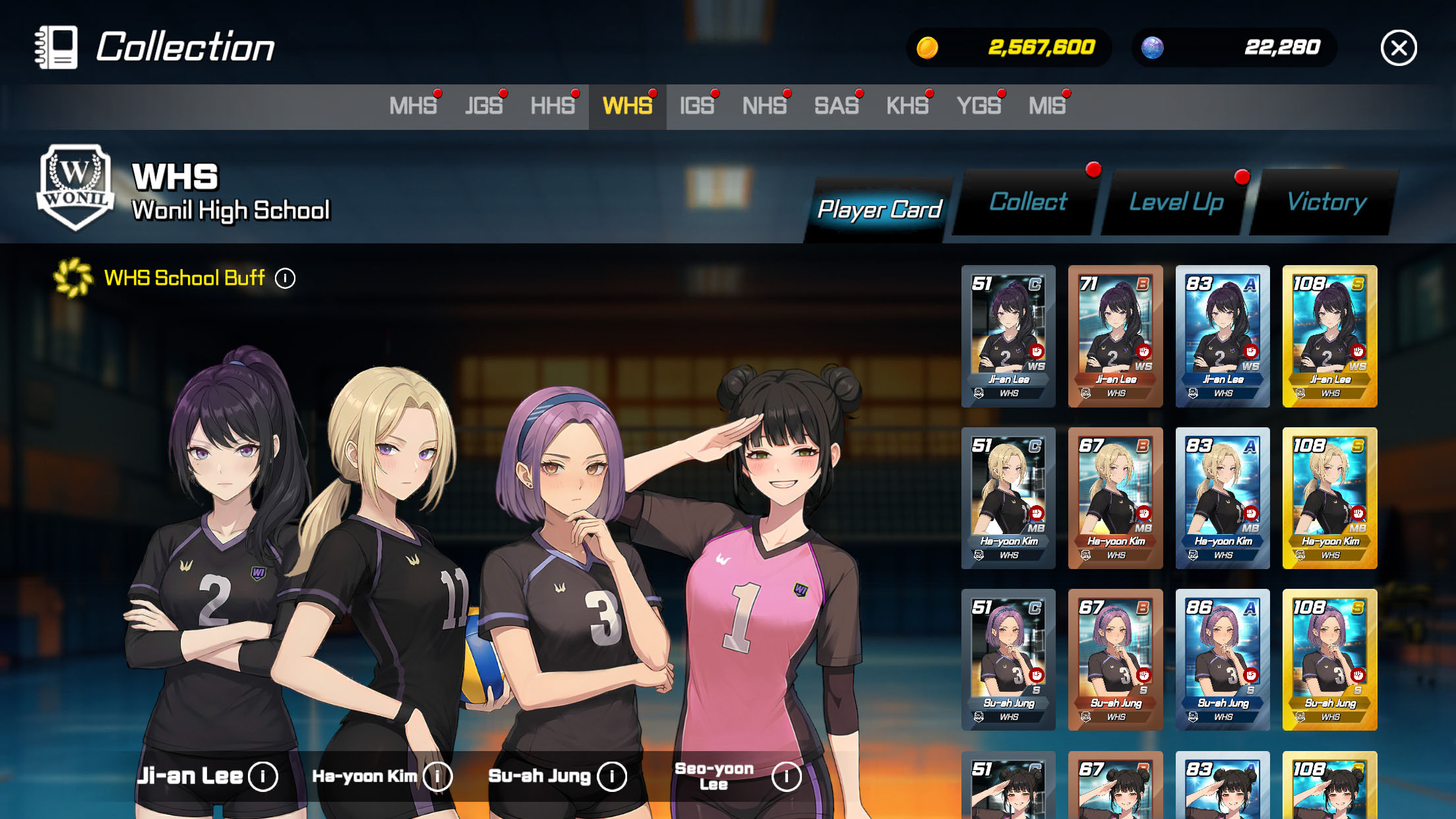 Соберите свою идеальную команду, набирая игроков с уникальными навыками из разных школ. Собирайте наборы карт для конкретных позиций и активируйте мощные школьные бонусы, выставляя на поле товарищей по команде из одной и той же альма-матер. Вы можете тренировать своих игроков, настраивать скины мячей и фоны лобби, а также разрабатывать стратегические комбинации персонажей, чтобы побеждать все более сильных противников.