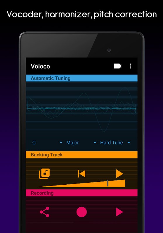 Voloco — программа обработки голоса в режиме реального времени, сочетающая в себе автоматическую настройку и кодирование речи. Вы можете выбрать композицию для аккомпанемента из вашей библиотеки, и Voloco автоматически определит ее тональность и высоту, подстраивая ваш голос к этой тональности. Voloco также позволяет записывать видео с вашим пением и делиться им с другими через Facebook* или Instagram*.