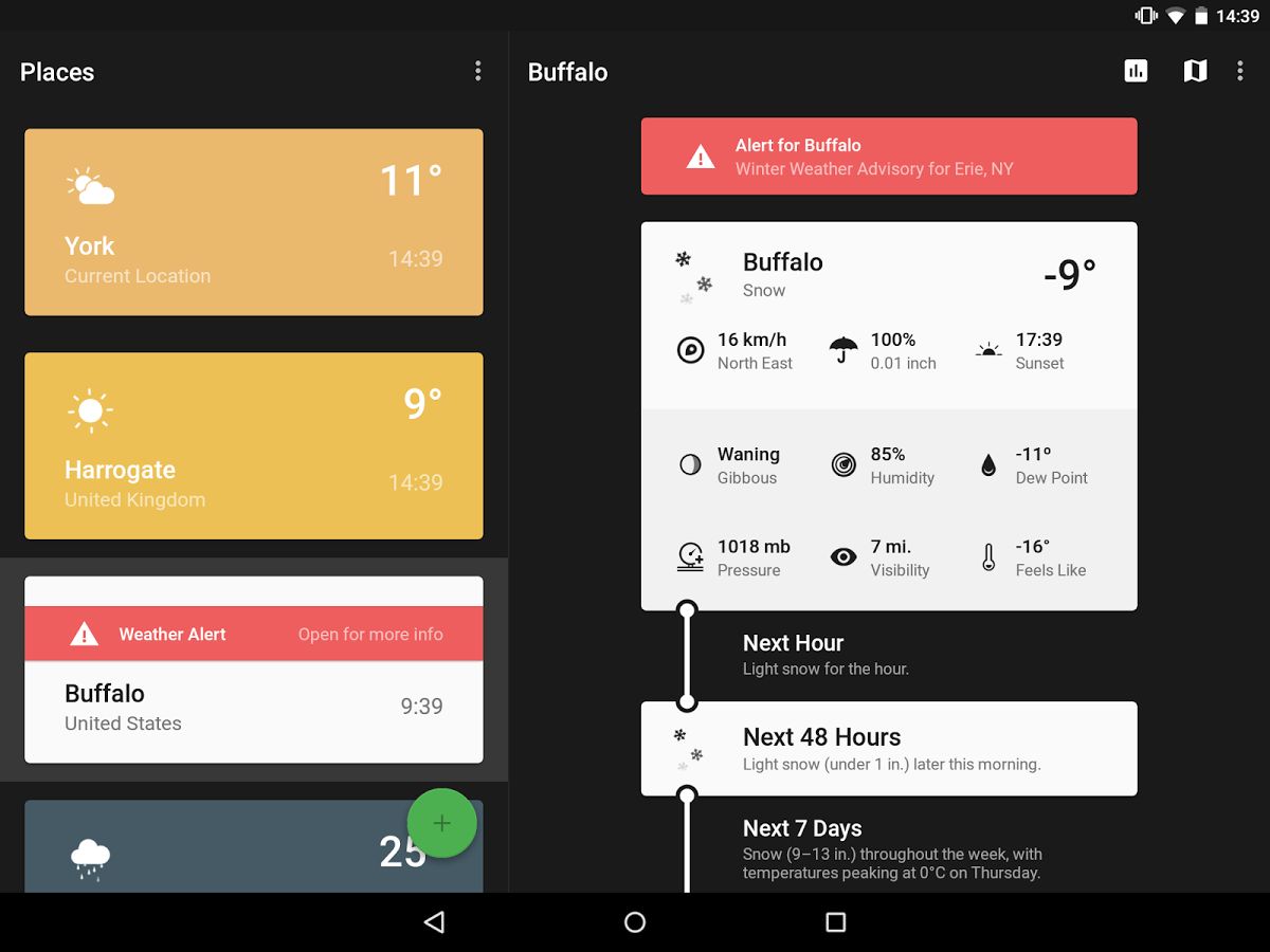 Weather Timeline – это простое погодное приложение, которое обобщает погодную статистику: на следующий час, следующие 48 часов и на следующую неделю. Так что у Вас все данные всегда под рукой! Вы получаете развернутый прогноз, просто взглянув на приложение. Также программа выделяет прогноз цветом, чтобы Вы всегда могли быстро понять, какие погодные условия ожидают Вас. Программа включает систему метео-предупреждений о текущей погоде для заданного местоположения и предоставляет функцию — «машина времени», что позволит Вам увидеть прогноз погоды на месяцы и даже годы вперед или узнать какой была погода пару – тройку десятилетий назад.
