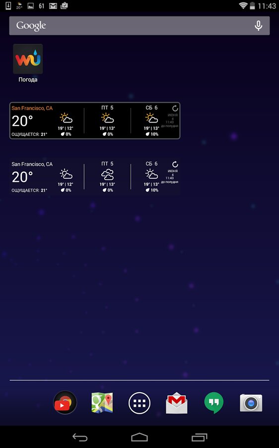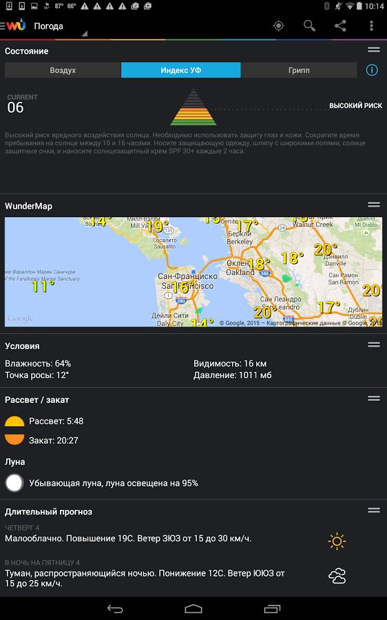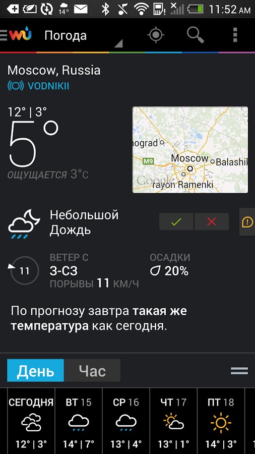 Weather Underground — позволяет получать самый точный локальный прогноз погоды и включает доступ к спутниковым данным и картам. Эти погодные данные, формируемые с помощью уникального сообщества энтузиастов метеорологии, передающих данные со своих погодных станций, позволяют формировать прогнозы погоды точно для Вашего местоположения.