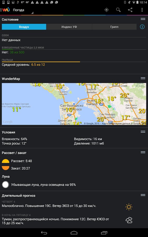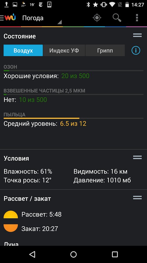 - текущие погодные условия с ближайшей погодной станции, включая температуру, температуру комфорта, скорость и направление ветра, влажность, точку росы, видимость, давление, порывы ветра и фазу луны;