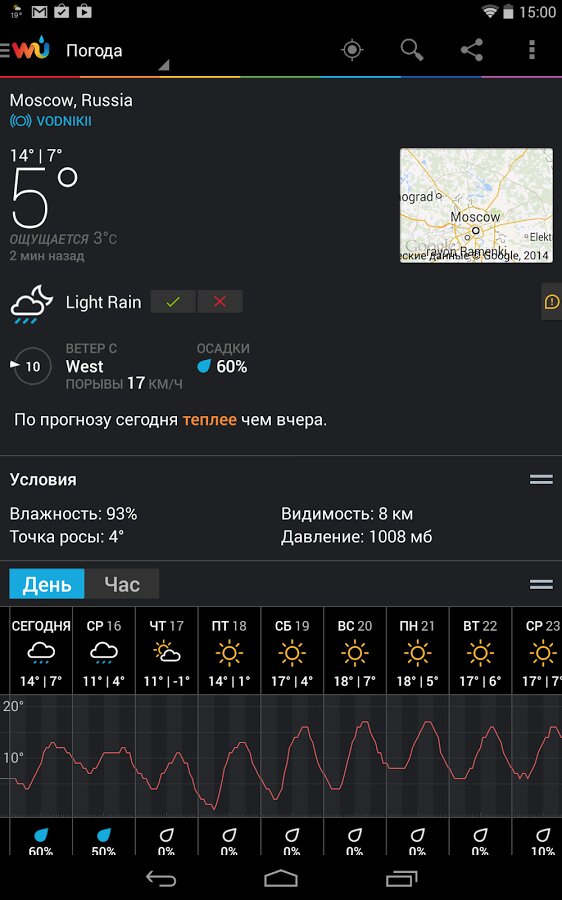 - возможность делиться погодными данными прямо в Twitter и следить за состоянием погоды в Wunderground;