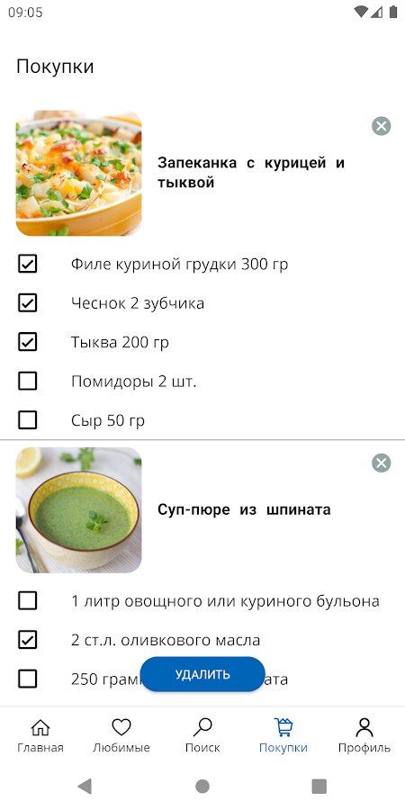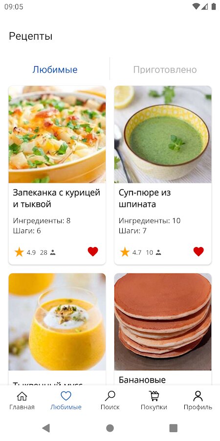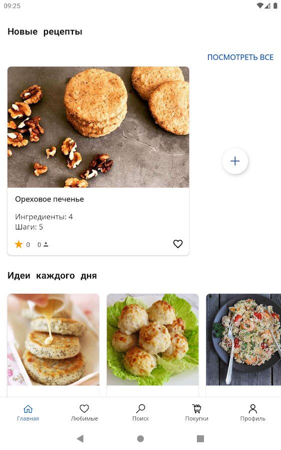 - Вы сможете выбирать понравившиеся Вам рецепты и сохранять их в Избранные. Также Вы сможете составлять план покупок продуктов для приготовления рецептов при походе в магазин.