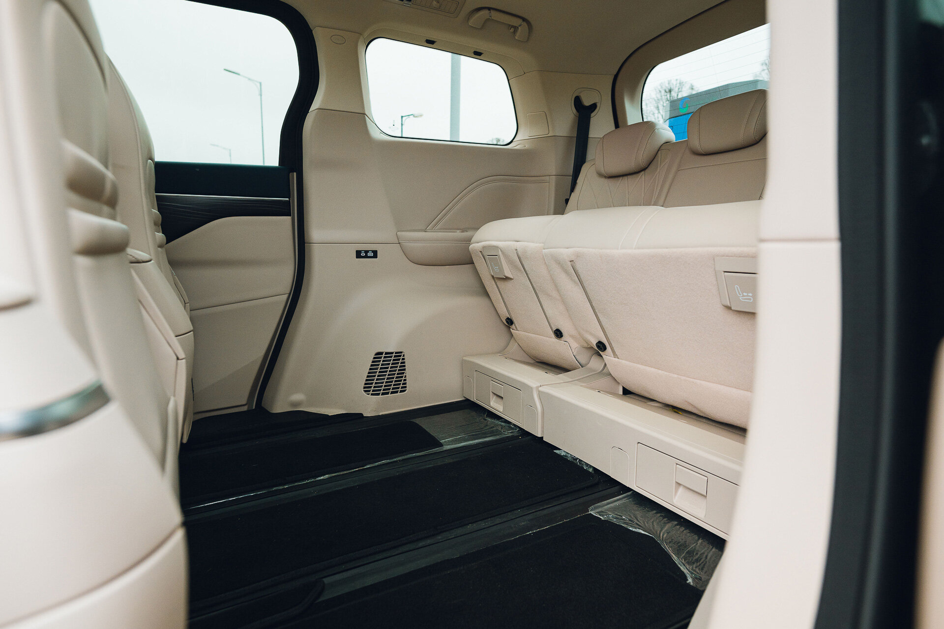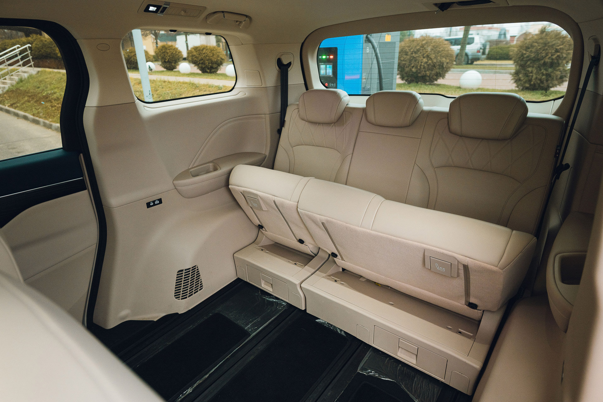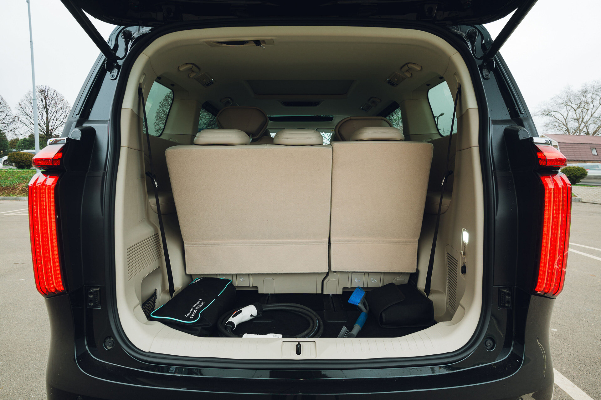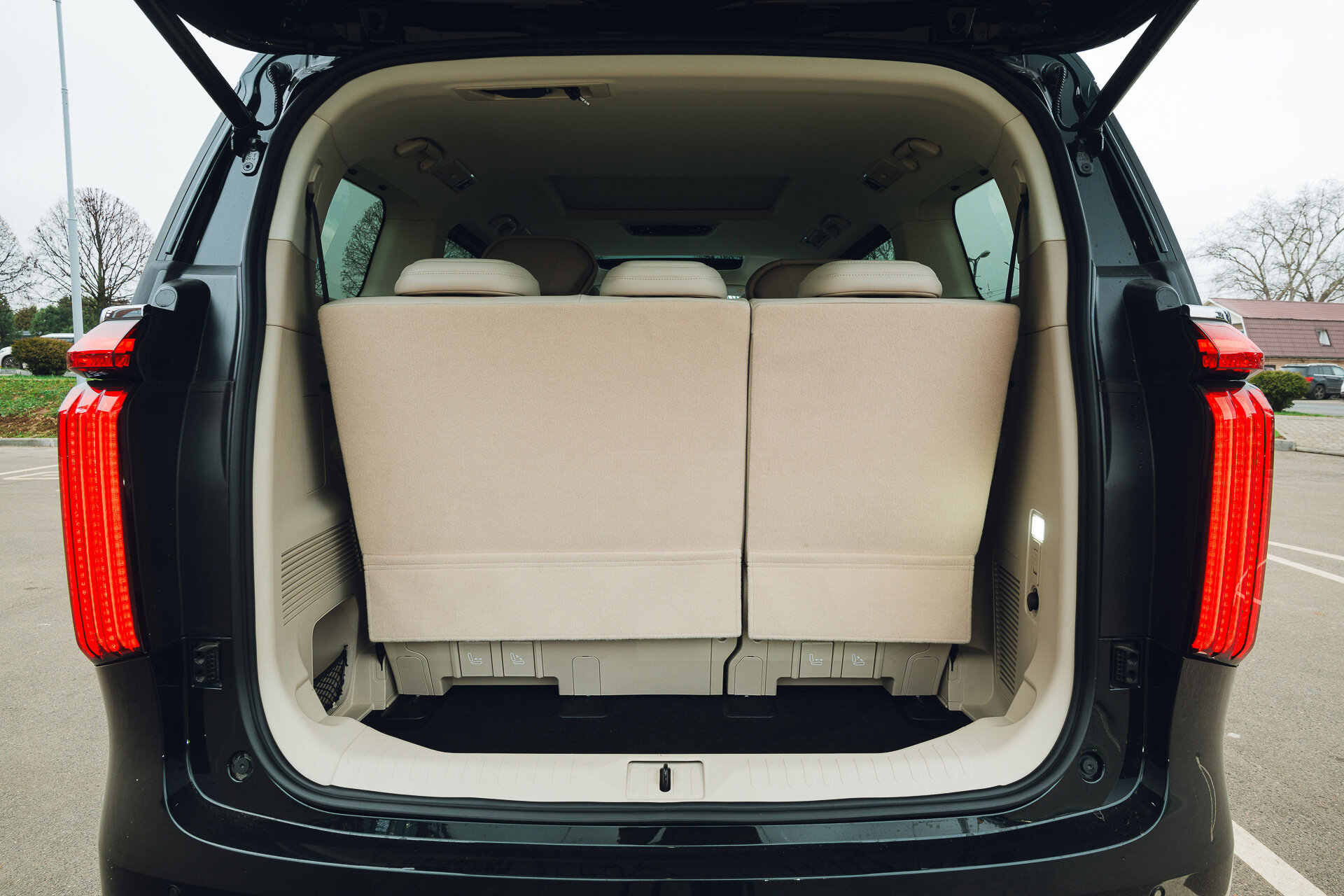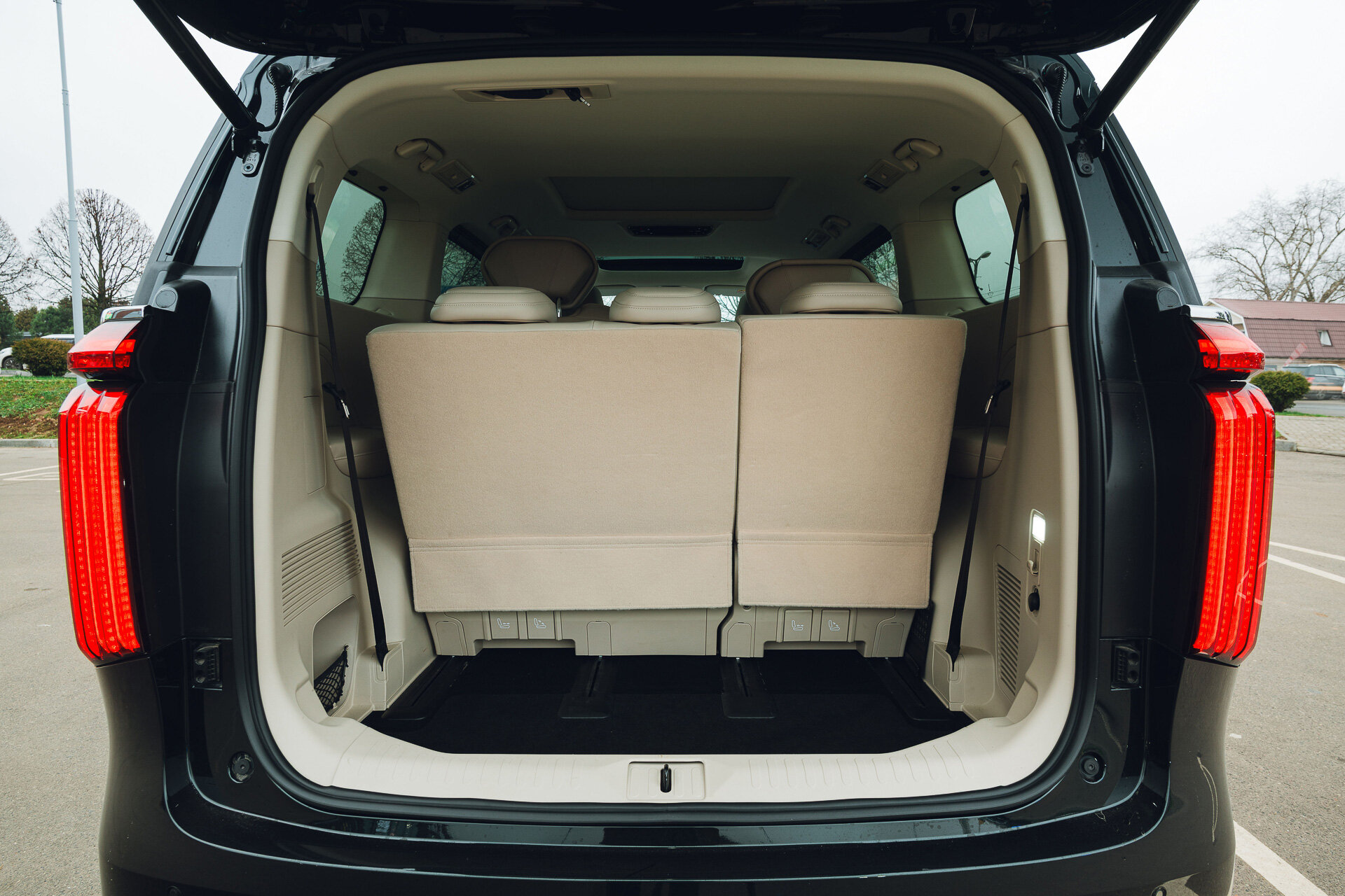 Начну, как всегда, с кормы. Несмотря на массивность задней двери, имеется сервопривод, что, несомненно, уже очень хорошо. Багажное отделение совсем небольшое. Сюда удобно вертикально поставить чемоданы. Большие, если подвинуть третий ряд; небольшие, если отдать приоритет пространству в салоне. Так что если кто-то соберётся большой семьёй или компанией путешествовать, придётся задуматься о размещении вещей.