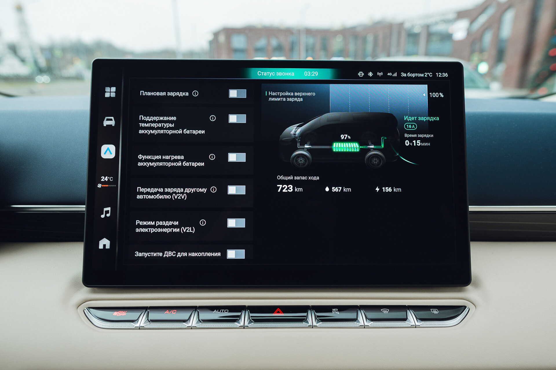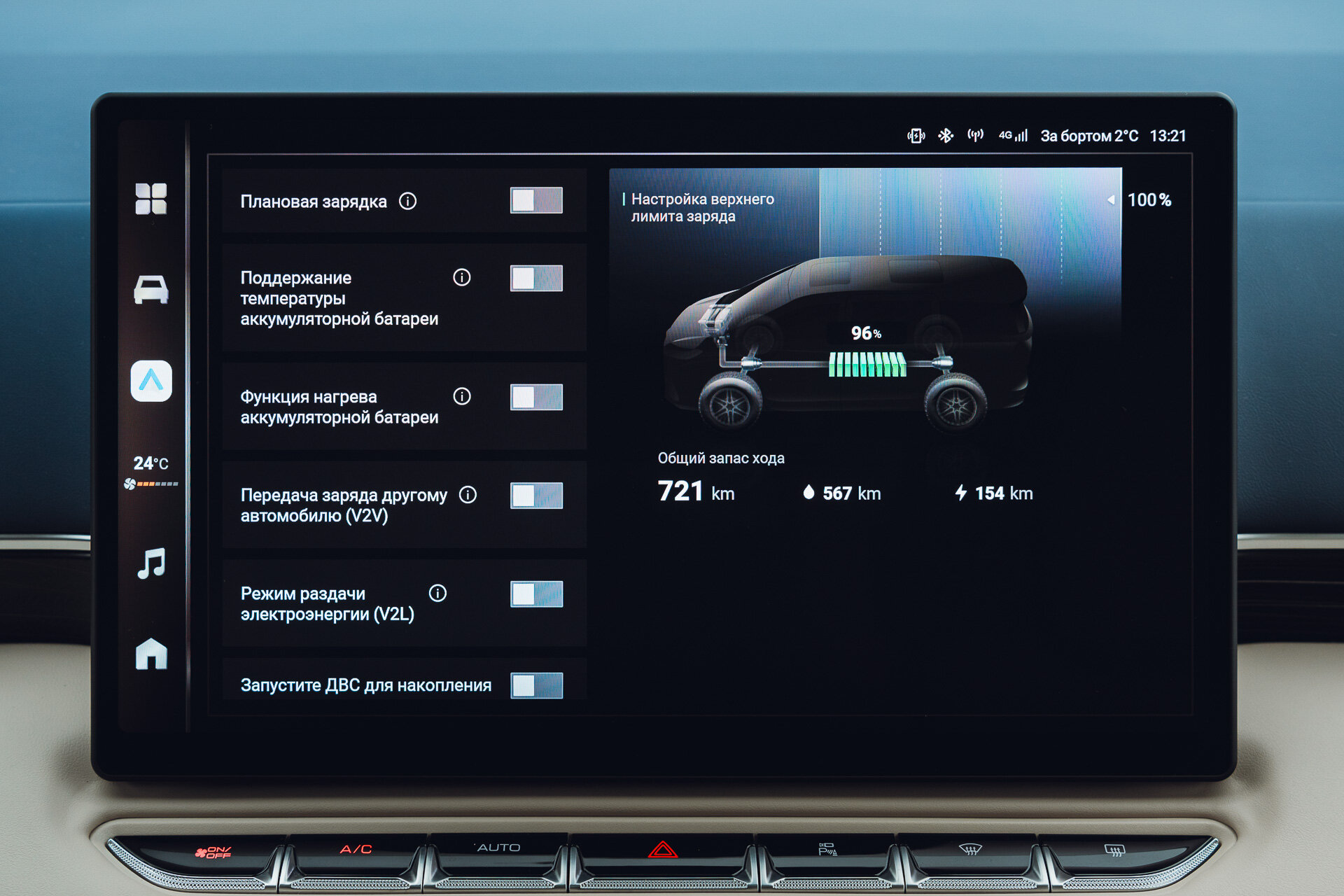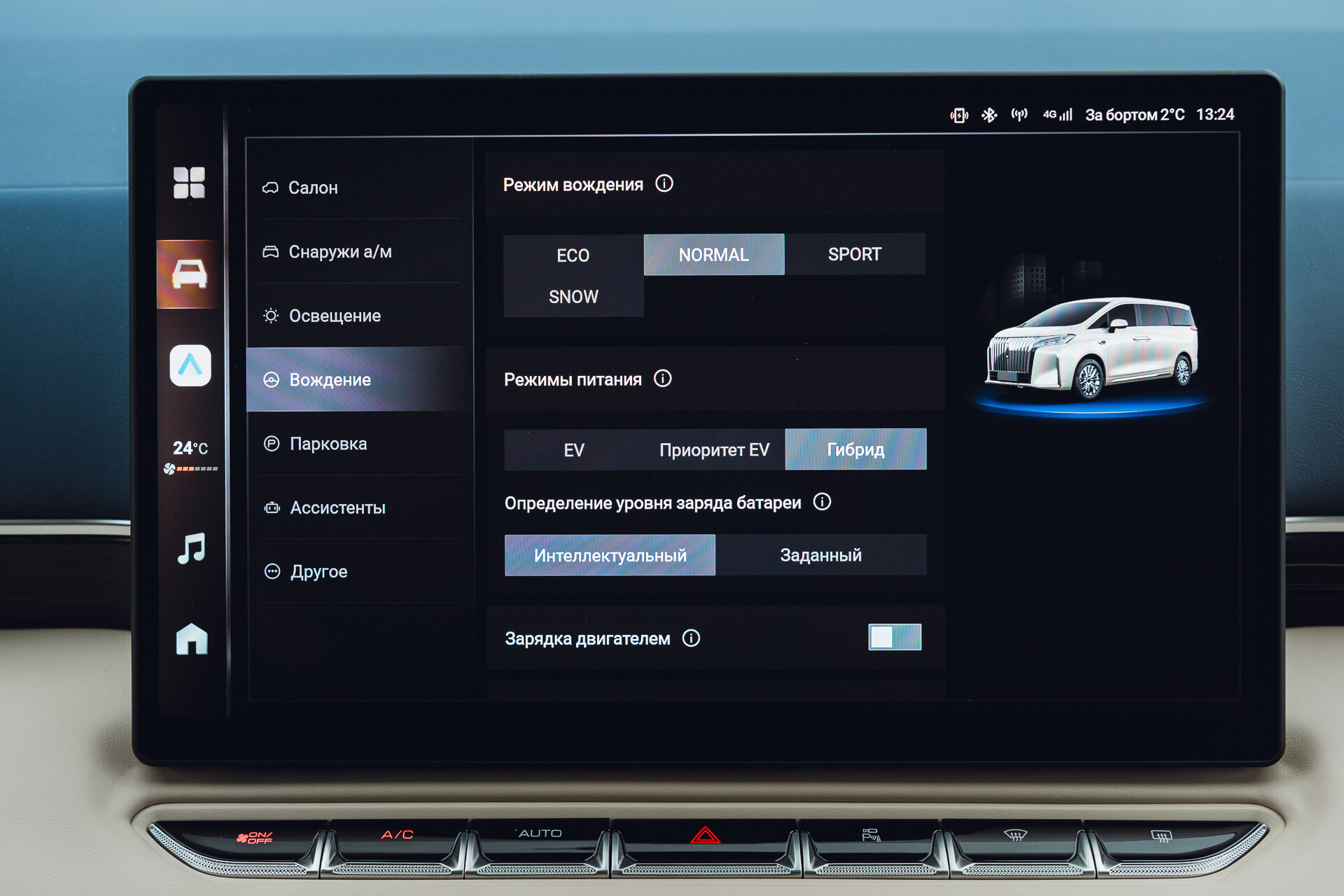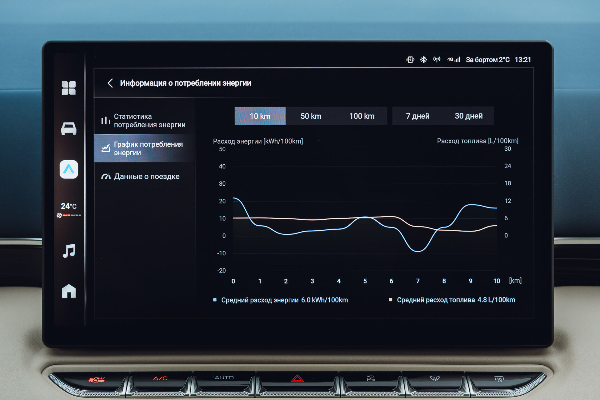 Но не забывайте, что на обочине с разряженной батарейкой этот автомобиль вас не оставит. Он сам себя будет заряжать, когда сочтёт нужным. Либо же можно принудительно активировать ДВС и приступить к зарядке.