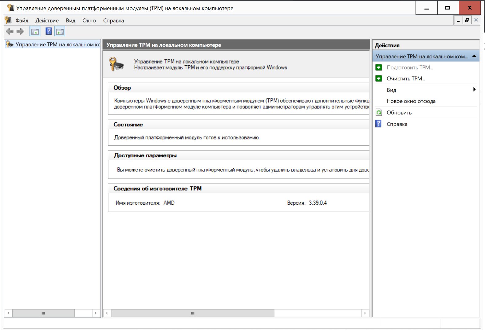 Способ 2. Запустите через окно «Выполнить» (Windows + R) или командную строку утилиту tpm.msc (наберите команду и нажмите Enter). Откроется «Управление доверенным платформенным модулем на локальном компьютере» — утилита отобразит наличие (или отсутствие) TPM, сведения об изготовителе модуля и текущую версию.