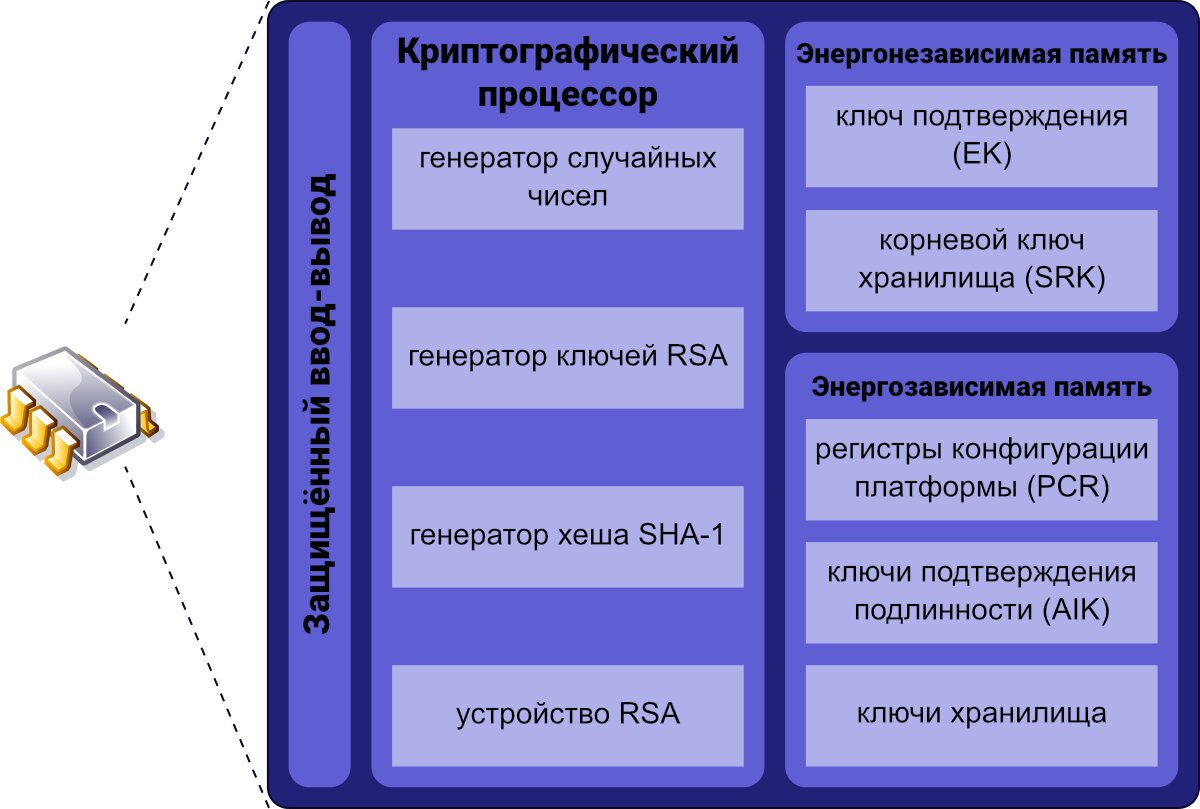 «Доверенный платформенный модуль» (TPM, Trusted Platform Module) — аппаратная технология безопасности для компьютеров, разработанная некоммерческой организацией Trusted Computing Group. Архитектура TPM реализована на основе нескольких компонентов: защищённый ввод-вывод, криптографический процессор, энергонезависимая память для хранения ключа подтверждения и энергозависимая память для хранения регистров конфигурации платформы.