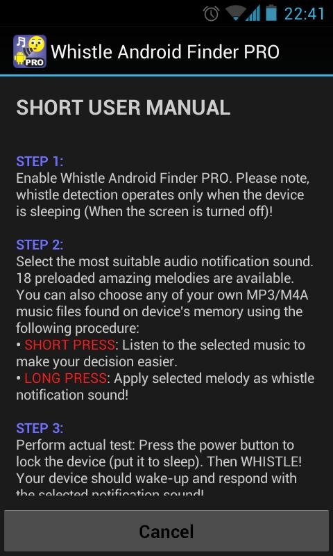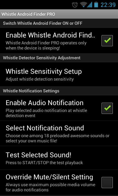 Программа Whistle Android Finder PRO помогает обладателям Android устройств находить их, в случае если владелец забыл куда положил свой планшет или смартфон. Для активации аудио сигнала устройства, необходимо свистнуть (достаточно громко, чтоб Android устройство смогло уловить звук). На некоторых моделях смартфонов программа может реагировать на хлопки. В качестве звукового уведомления можно установить любой MP3 или M4A файл, кроме того, Whistle Android Finder PRO предоставляет множество стандартных тематических звонков на выбор. Приложение работает только в том случае, если Android устройство в спящем режиме.