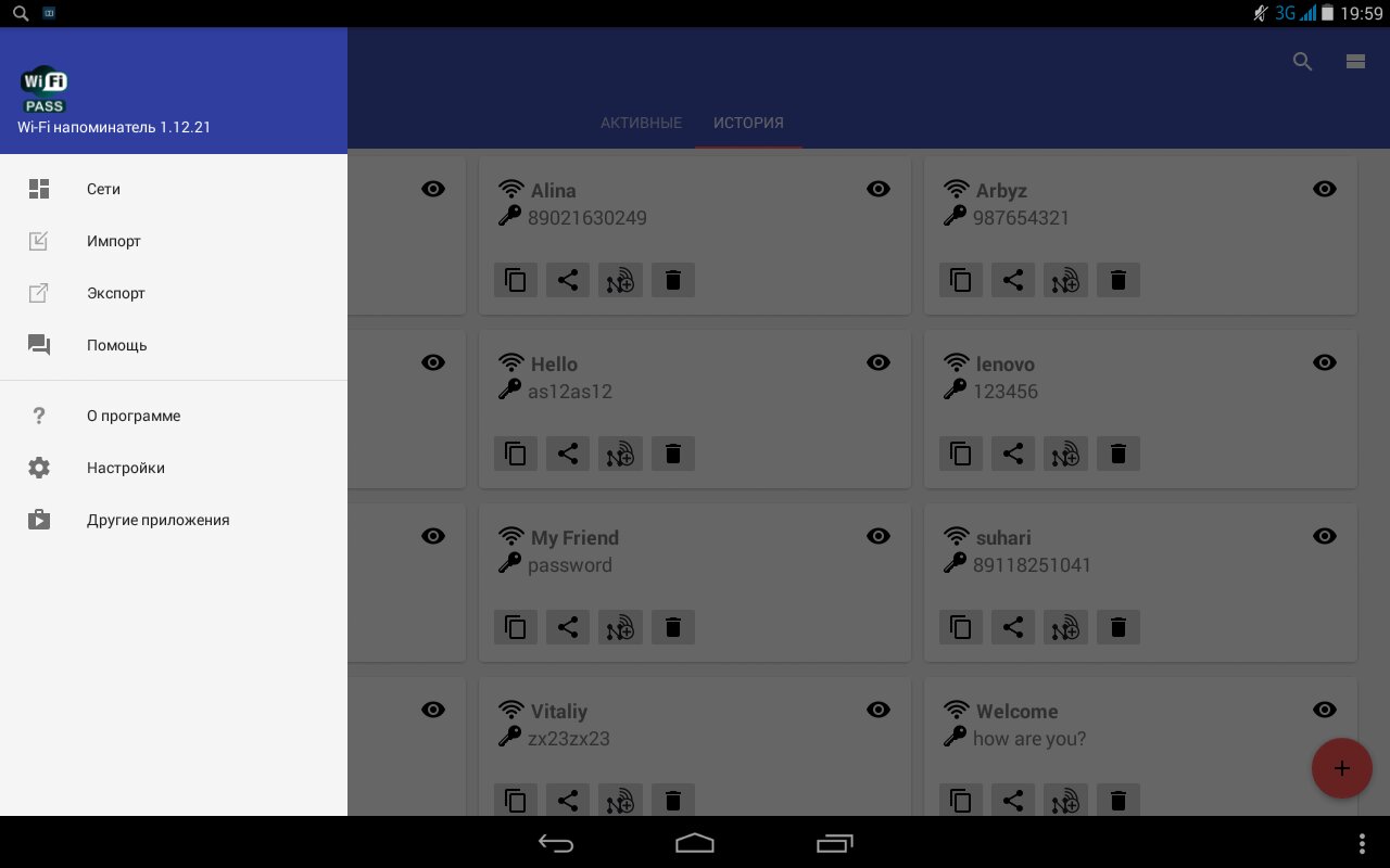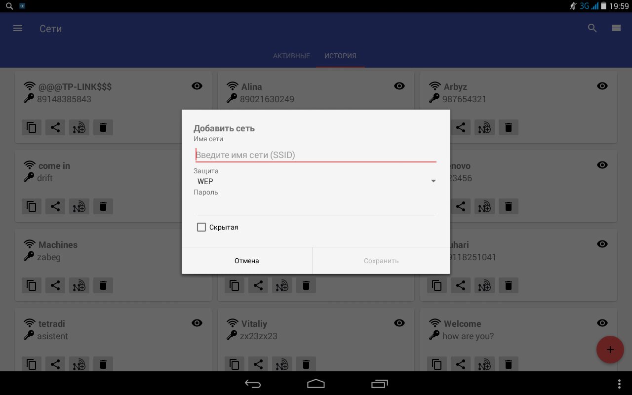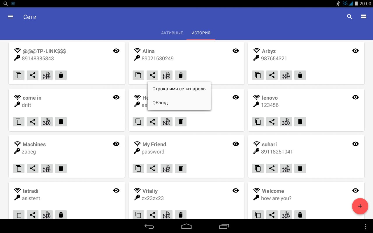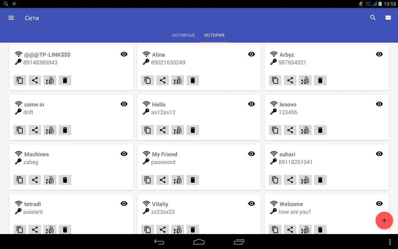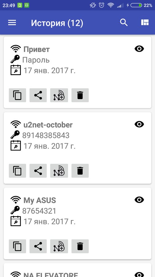 Если вы случайно удалили нужную сеть из памяти устройства, на вкладке «История» вы можете увидеть ранее подключенные сети. История подключений обновляется автоматически при каждом запуске приложения. Есть возможность копирования паролей сетей и удаления сетей из истории. Реализовано сохранение настроек при помощи Android Backup Service от Google, т.е при перестановки, приложение должно автоматически восстановить историю сетей.