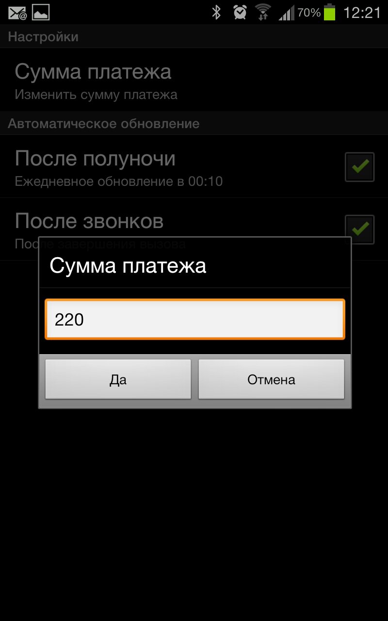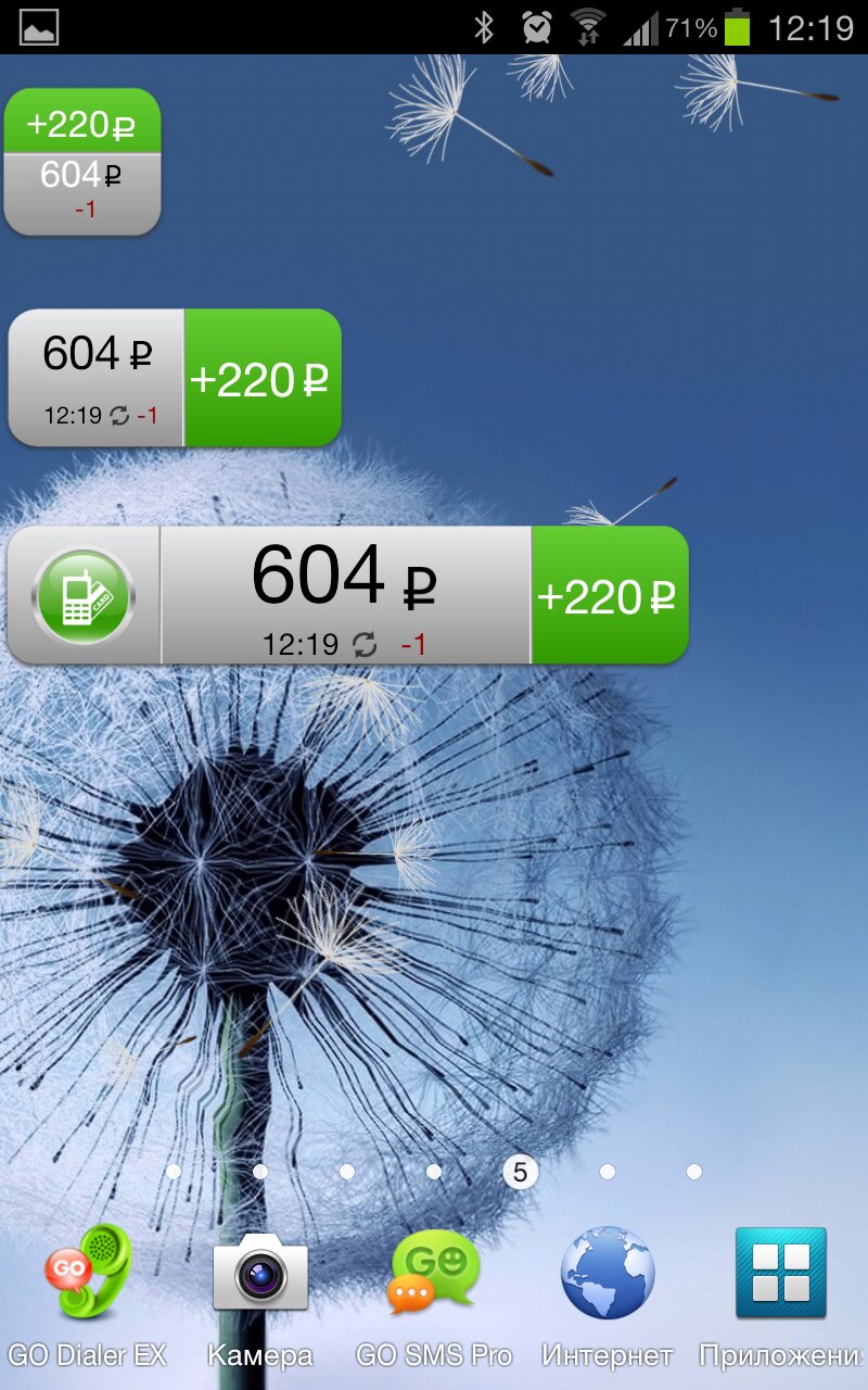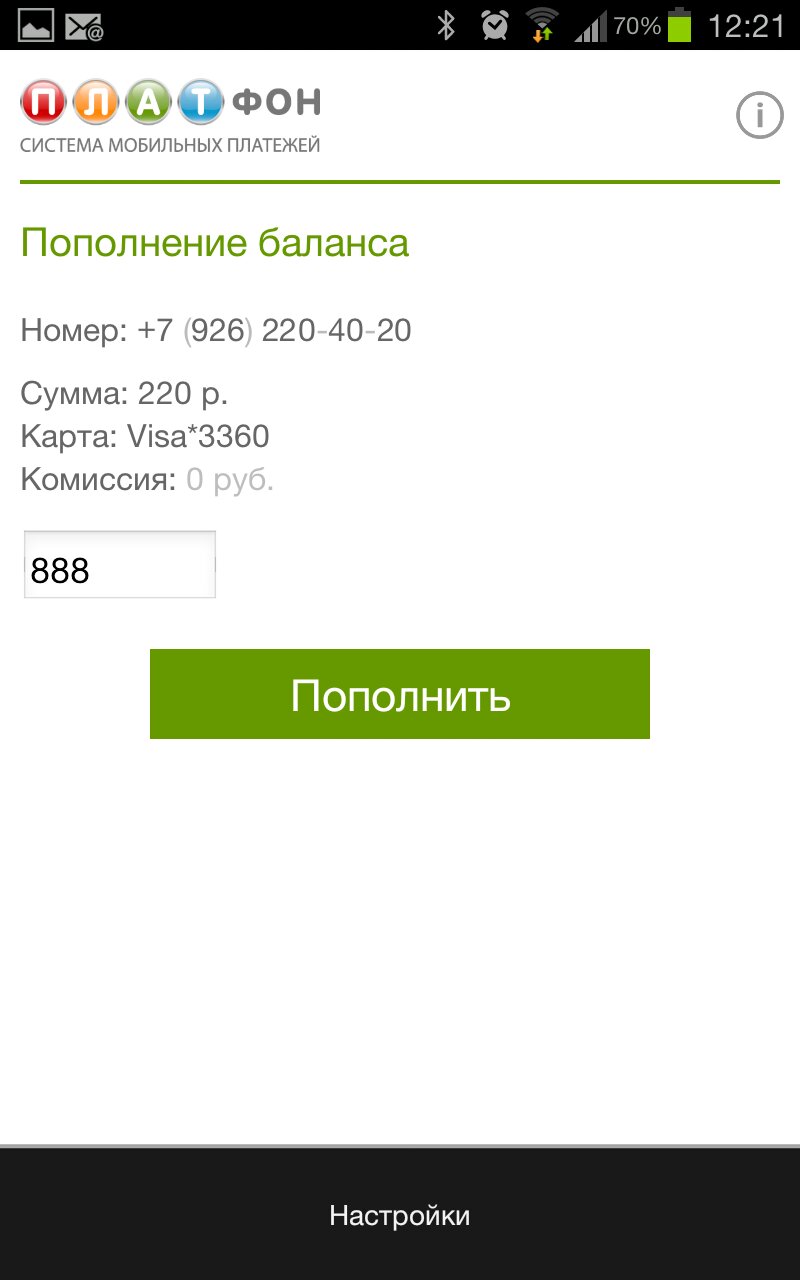 Показывает баланс телефона и позволяет пополнять его одной кнопкой с банковской карты.