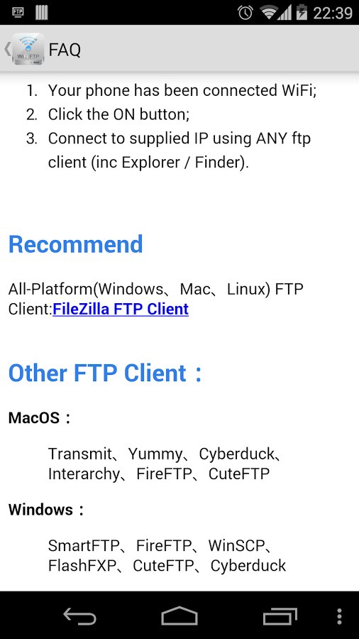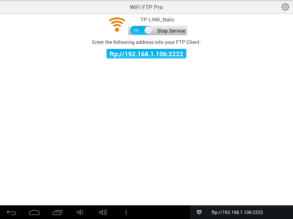 Всё что вам нужно сделать, это запустить Wifi FTP > Нажать на кнопку ON > Использовать адрес в любом ftp-клиенте.