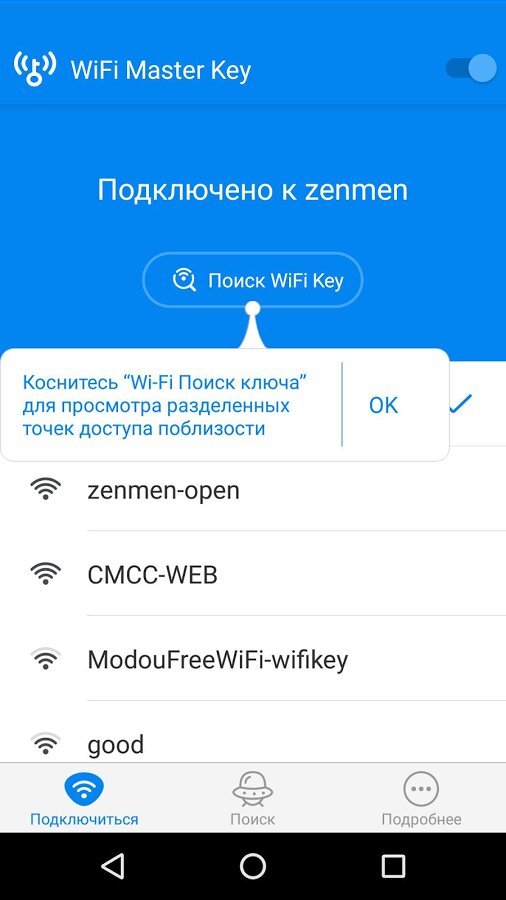 WiFi Master Key — безопасный и быстрый интернет везде и всегда, по крайней мере, по заверениям разработчиков. Если же присмотреться внимательнее, то это обычная программа по распространению ключей на беспроводные точки доступа к интернету. Но у нее есть особое преимущество перед конкурентами — более 10 млн установок, что гарантирует наличие ключей к популярным точкам в крупных населённых пунктах.