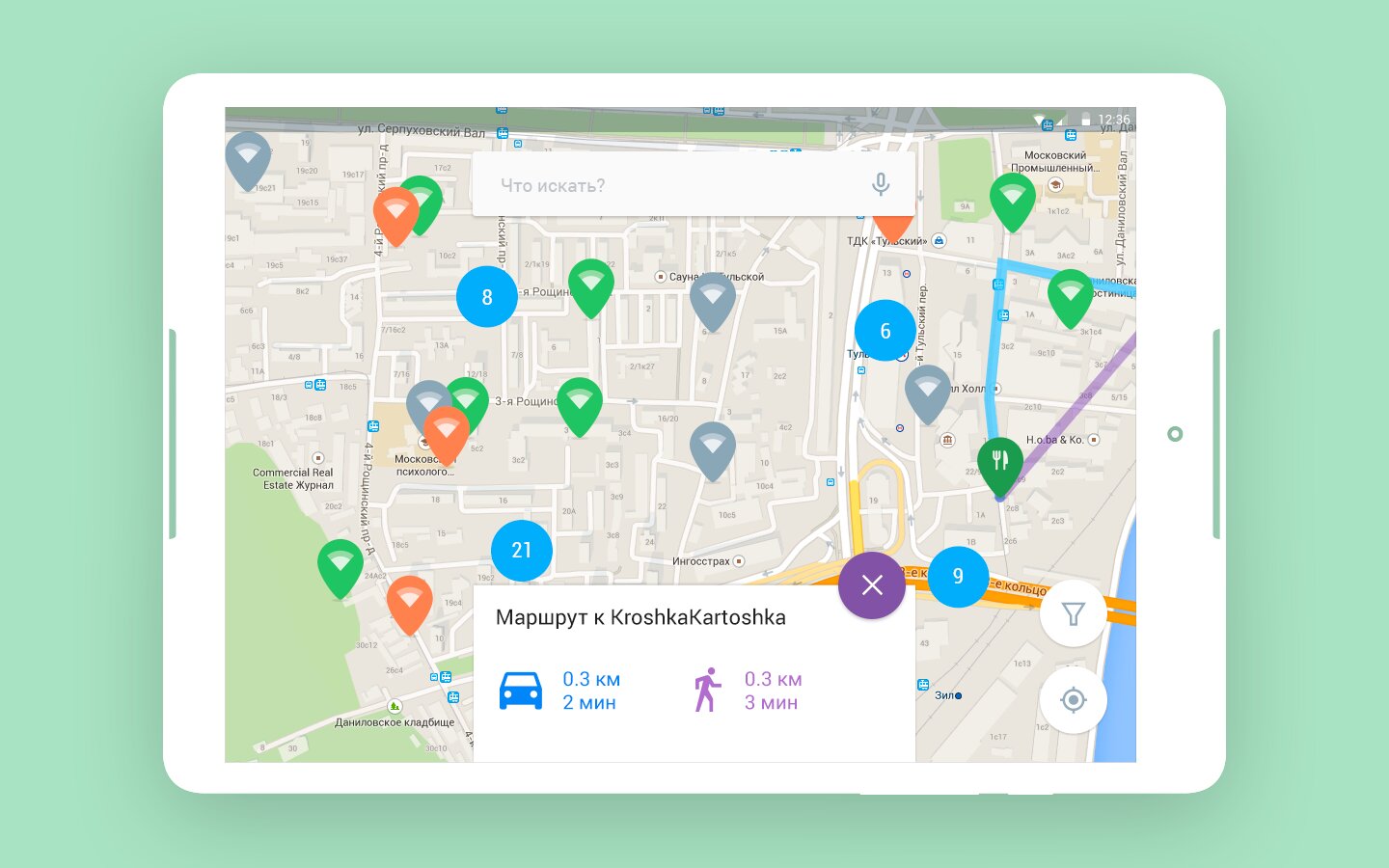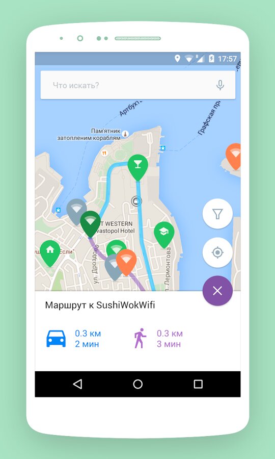 — создать пеший и авто-маршрут до нужной точки wifi