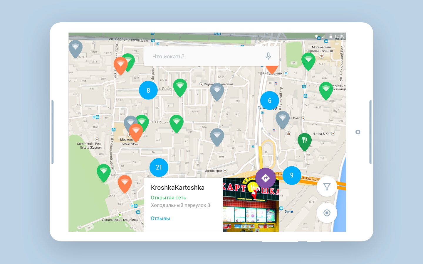 — найти информацию о месте расположения хотспота, качестве соединения, типе точки доступа (открытая сеть, коммерческая, закрытая), фото местности