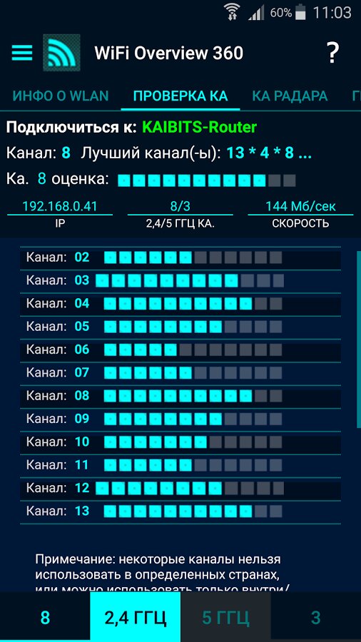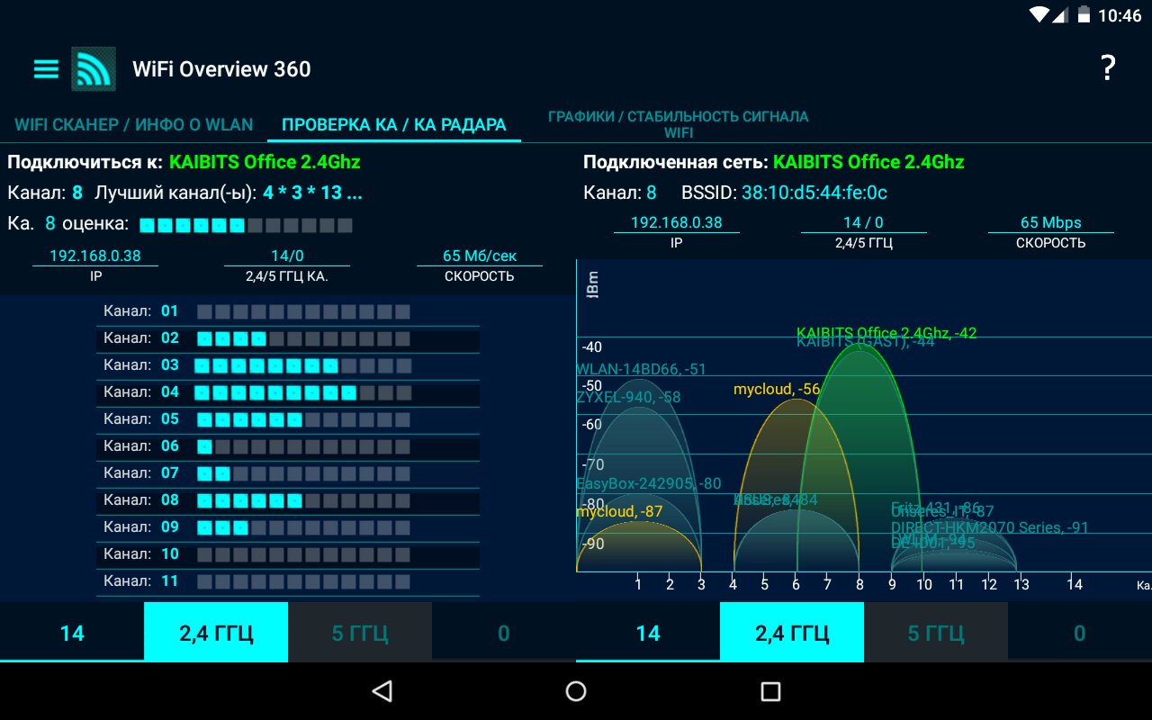 Вкладки «Ch check» (Проверка канала) и «Ch. Radar» (радиолокационный канал) являются мощным инструментом для оптимизации своей сети WLAN. Для лучшей производительности вашей сети должны использовать канал или частотный диапазон, где нет других беспроводных сетей или как можно меньше. Overview Wi-Fi 360 дает Вам лучший выбор канала.
