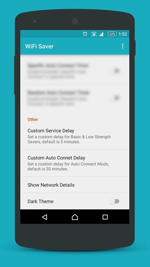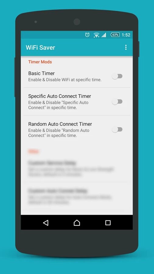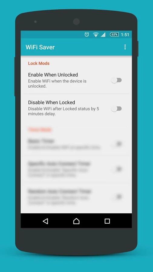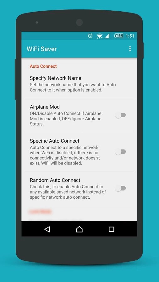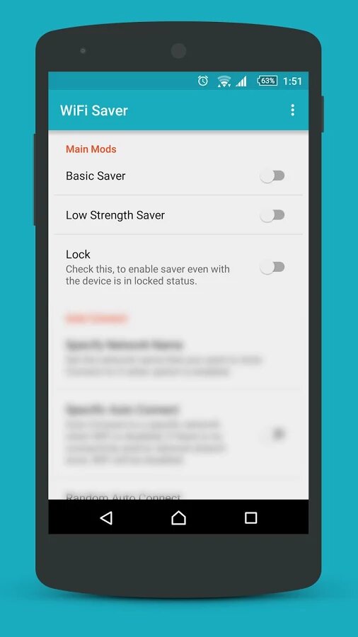 WiFi Saver — удобная утилита, которая позволяет автоматически управлять подключением Wi-Fi для сохранения заряда аккумулятора. Основной функционал программы — это выключение модуля Wi-Fi, когда устройство находится в режиме ожидания или когда приложения и операционная система не запрашивают подключение к интернету. Также в WiFi Saver есть несколько режимов, которые управляют подключением по разному: Low Strength Save — отключение сети, если ее сигнал слишком слабый; Random Auto Connect — автоматический перебор и подключение к сетям с самым сильным сигналом; Specific Auto Connect — перебор только заранее заданных сетей и прочие.