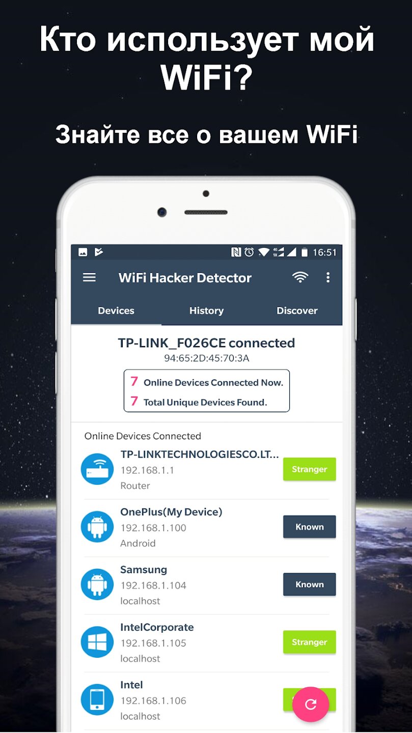 Кто использует мой WiFi? — это сканер WiFi-сетей и утилита безопасности, предназначенная для обнаружения неизвестных устройств в вашей домашней сети. Это приложение, также известное как WiFi Thief Detector, помогает вам защитить безопасность вашей WiFi-сети, определяя, кто подключен к вашему маршрутизатору, что позволяет вам с легкостью блокировать неавторизованных пользователей и отслеживать активность в вашей сети.