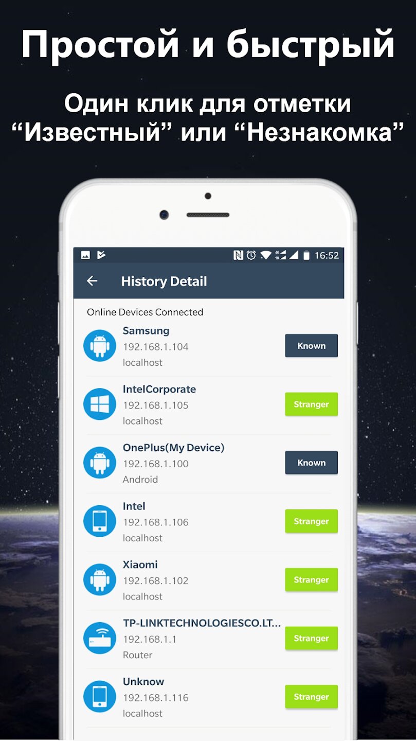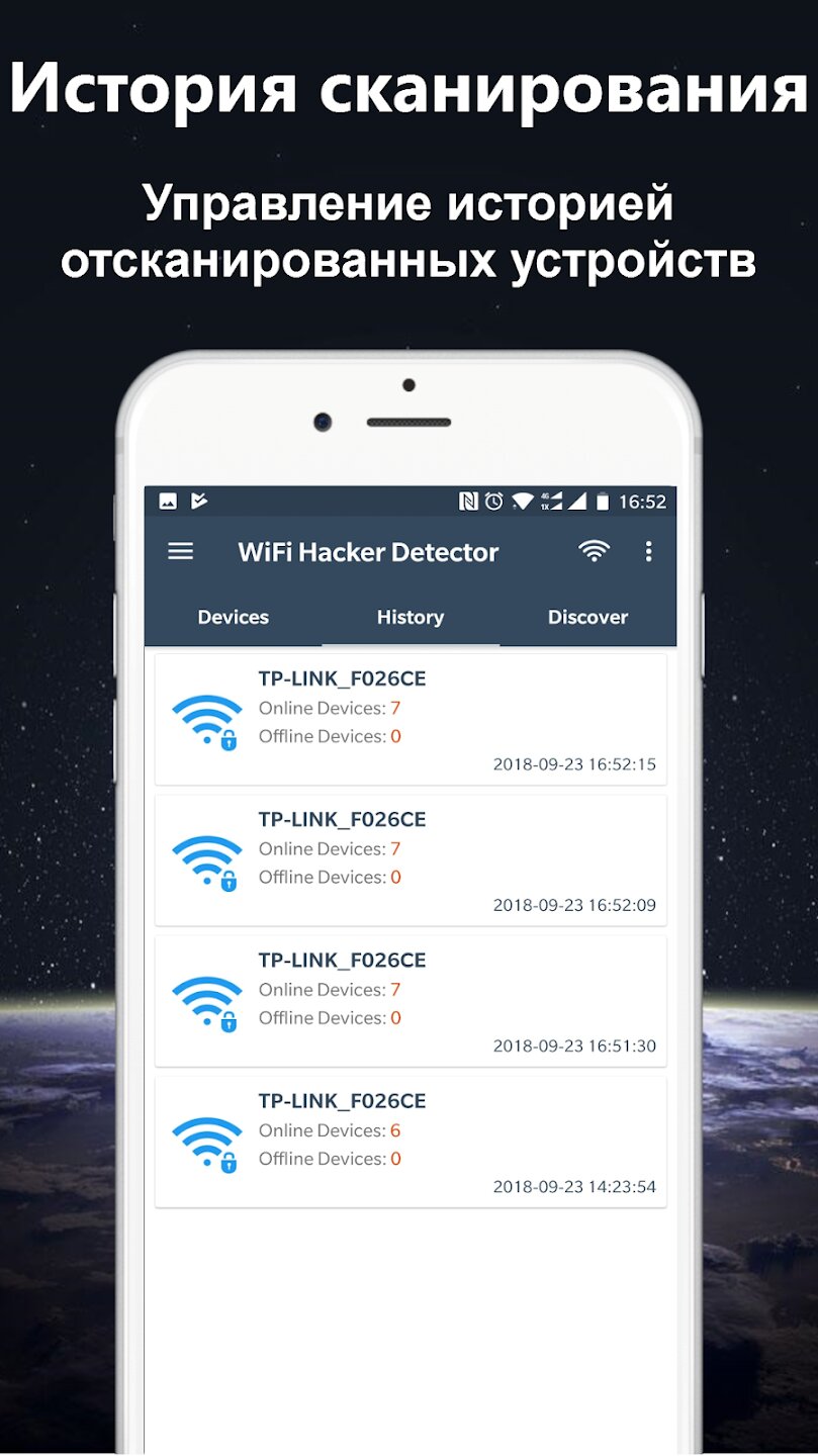 - Сканер WiFi-сети в режиме реального времени для обнаружения подключенных устройств.