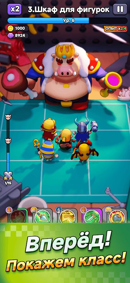 - Авто-бой с тактическими решениями и прокачкой отряда