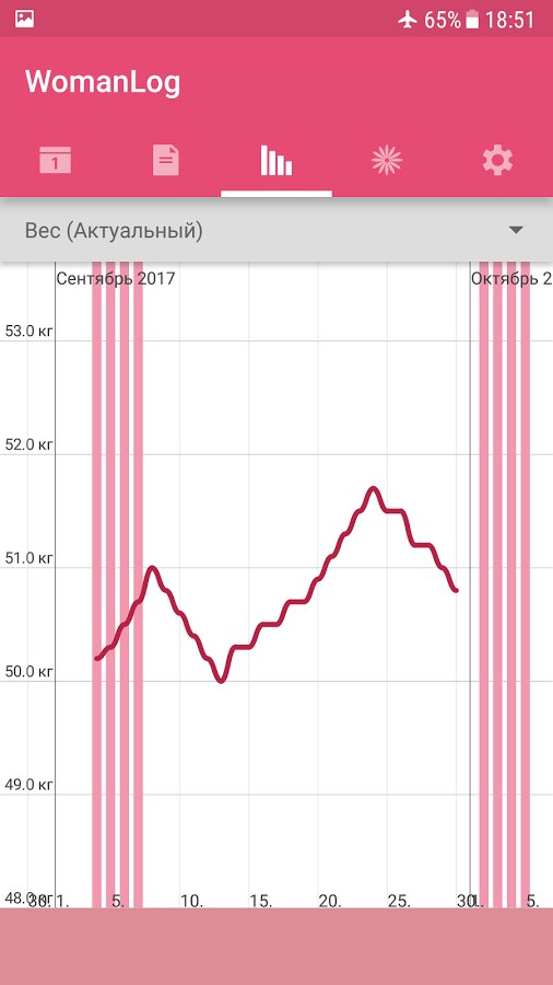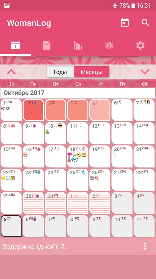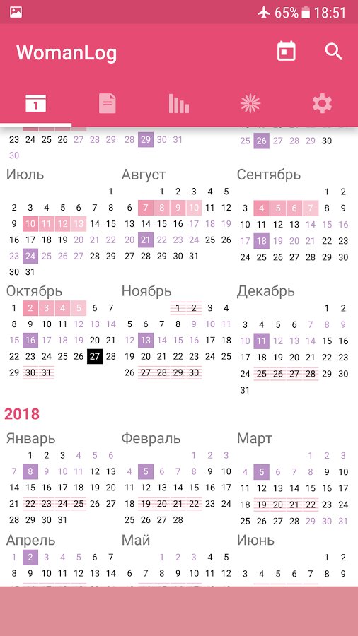 WomanLog Calendar — удобный расчет и прогнозирование месячных/овуляторных циклов. Овуляция показана звездочкой, опасные дни — сиреневым цветком. При наклоне выдает резюме за три месяца. Можно защитить паролем, следить за весом, смотреть статистику.