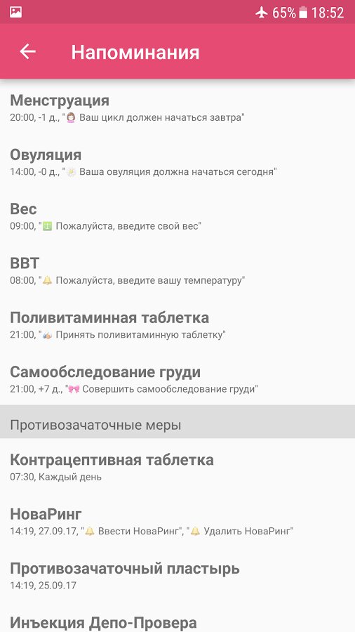- Различные ежедневные напоминания: менструация, овуляция, вес, базальная температура тела, мультивитаминные таблетки, самообследование груди, противозачаточные таблетки, НоваРинг, противозачаточные пластыри, инъекции Депо-Провера, ВМС.