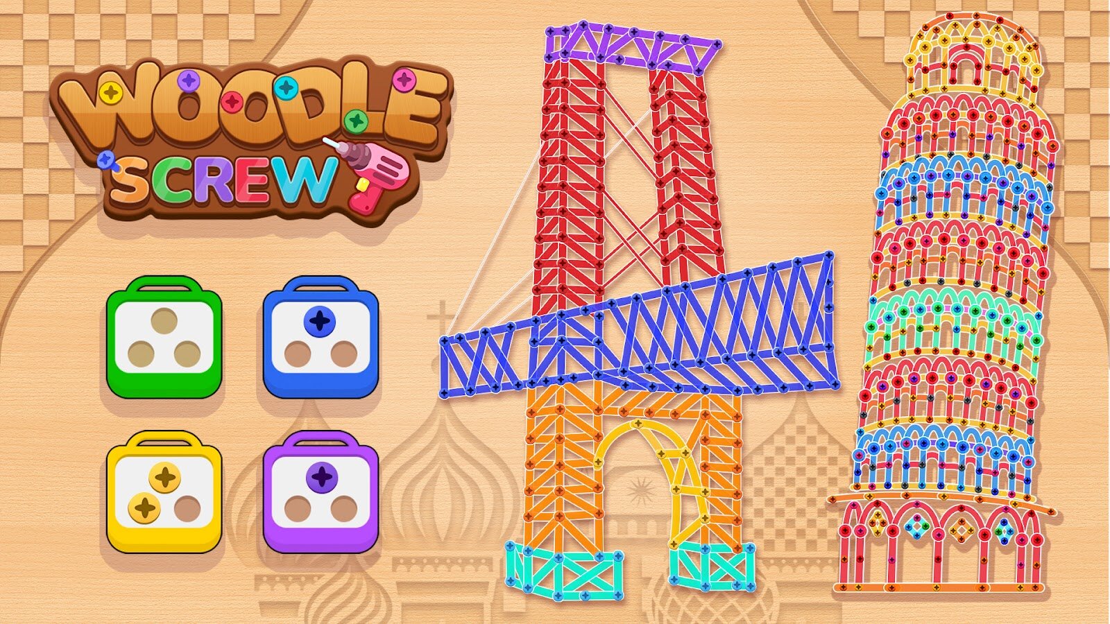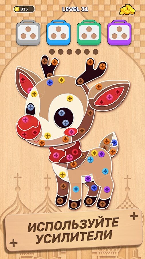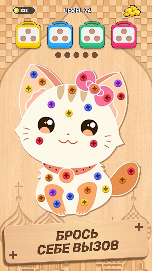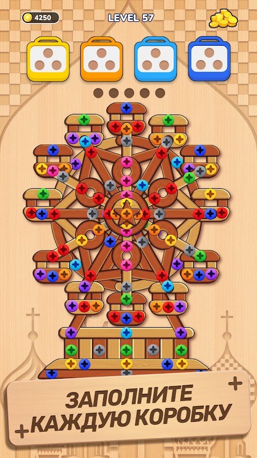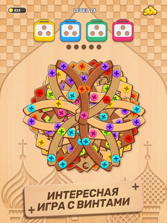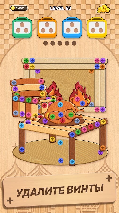 Вам предстоит откручивать штифты, сортировать болты и решать замысловатые задачи в окружении визуально приятного деревянного дизайна и ярких цветов. Эта игра требует точного расчета и стратегического мышления, превращая обычную механику «отвинти и вставь» в интеллектуальный вызов с эстетическим удовольствием.