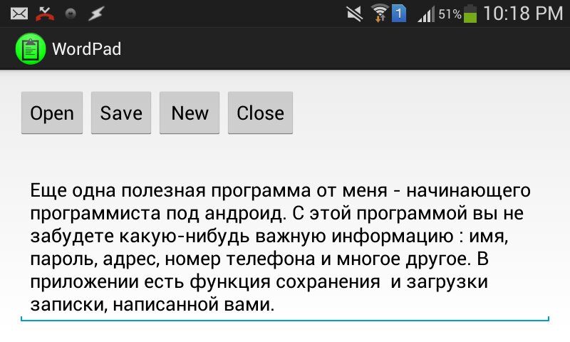 Еще одна полезная программа от меня — начинающего программиста под андроид. С этой программой вы не забудете какую-нибудь важную информацию: имя, пароль, адрес, номер телефона и многое другое. В приложении есть функция сохранения и загрузки записки, написанной вами.