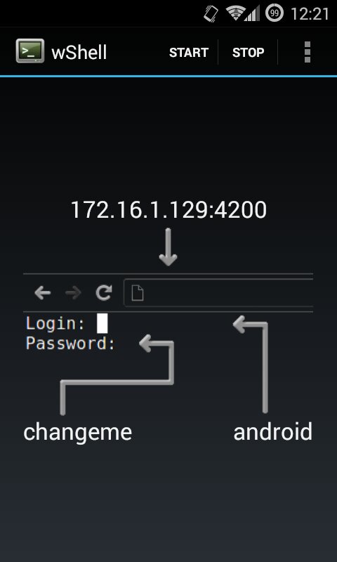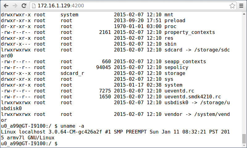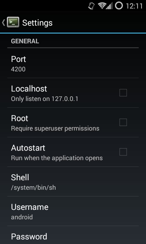 Эмулятор терминала с веб-интерфейсом. Основан на Shell In A Box. Если Android-устройство и компьютер находятся в одной локальной сети, то можно с компьютера получить доступ к консоли устройства через веб-браузер.