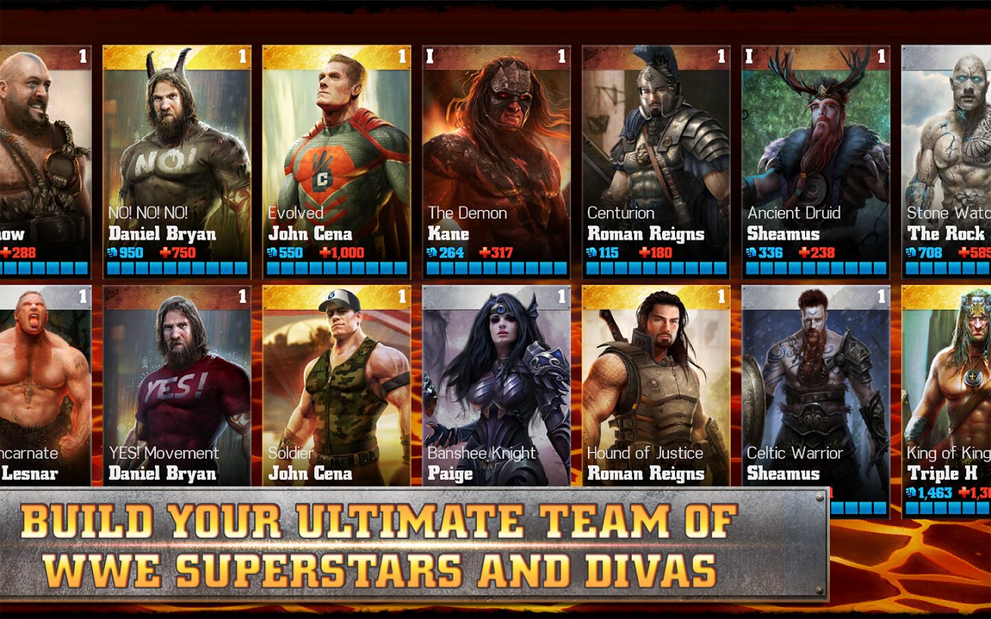 Собирайте для игры фантастические версии своих любимых свперзвезд WWE: Triple H, John Cena, The Undertaker, The Bella Twins, The Rock, Hulk Hogan и многих других. У кажой суперзвезды есть уникальные варианты со своими особыми способностями и приемами.