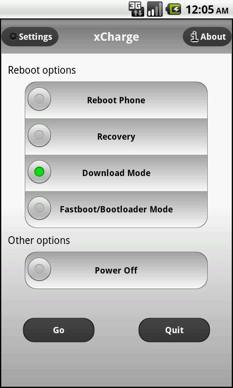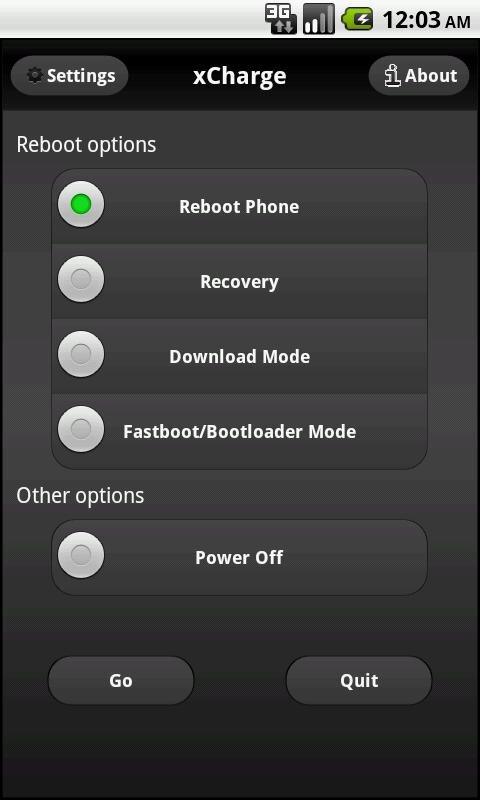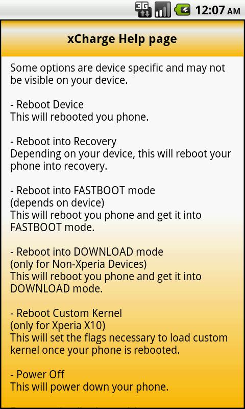 xCharge Reboot Options — дает полный контроль над доступными опциями перезагрузки для устройств Android. Такими, как: Fastboot, Recovery, Download and emergency reboot / power modes. По мере развития кастомных ядр в приложение будут добавлятся дополнительные функции. Так как программа изначально создавалась для владельцев смартфонов-Sony Ericsson XPERIA X10-она наиболее полезна и эфективна для этих телефонов, особенно после разлочивания загрузчика, так как дает возможность загрузки в разные Recovery( при их наличии) и загрузки кастомных ядер.