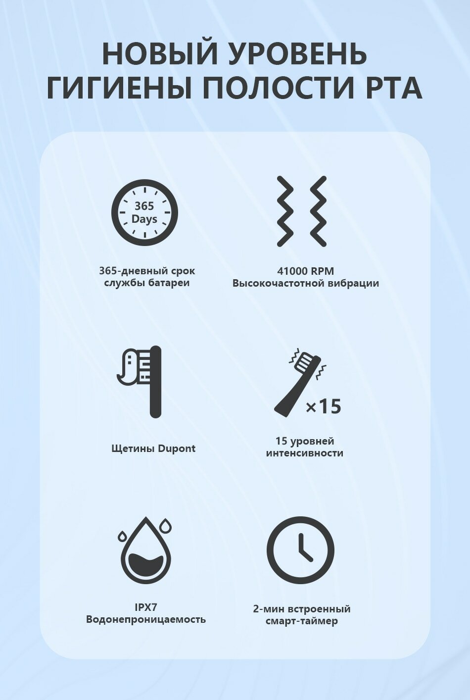 При этом производитель не сэкономил на прочих характеристиках — щётка поддерживает 15 типов работы, то есть 5 режимов чистки с 3 уровнями интенсивности для каждого из них (заявленные 365 дней автономной работы относятся к минимальной интенсивности). При этом Nandme NX 7000 очень тихая — максимальный шум составляет всего лишь 68 дБ. В щётке есть встроенная память, благодаря чему нужный режим работы не придётся каждый раз выбирать.