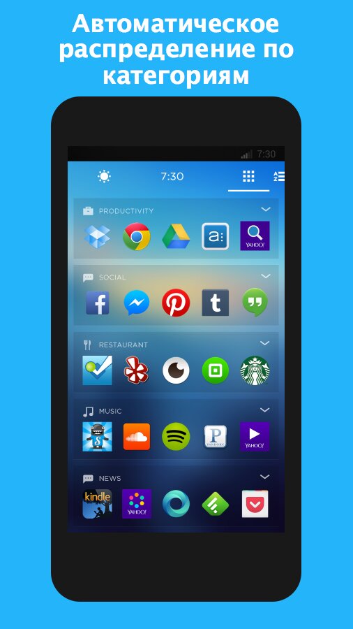Yahoo Aviate — это лаунчер, который преобразит ваш телефон. Прошло то время, когда экраны всех телефонов на базе Android, заполненные до отказа значками, имели стандартный, скучный вид. Yahoo Aviate автоматически упорядочивает приложения и отображает только нужную информацию в нужное время. Все ваши приложения и данные — так, как вы хотели!