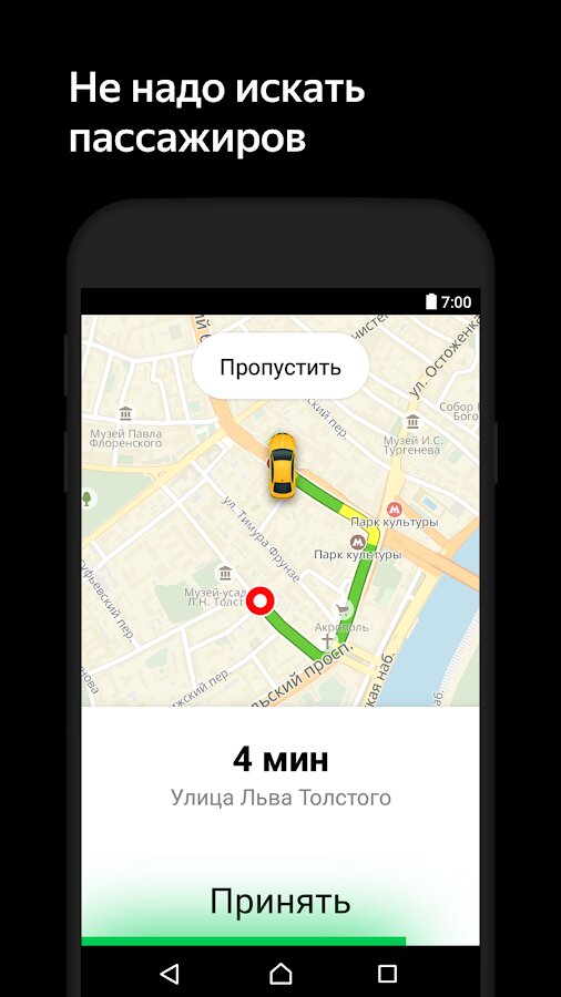Вам не придется искать самостоятельно пассажиров, ведь они сами найдут Вас! Вы будете через приложение получить заказы от тех, кто находится ближе всего к вам. Система устроена так, чтобы бесполезный пробег автомобиля снижается, а заработок увеличивался! Плюс в дополнение к Таксометру идет Яндекс. Навигатор. Он сможет проложить маршрут к нужной точке и даст подсказки.
