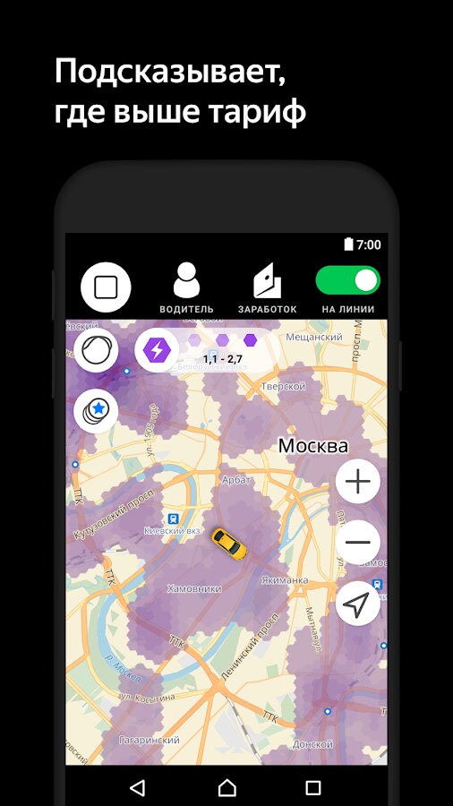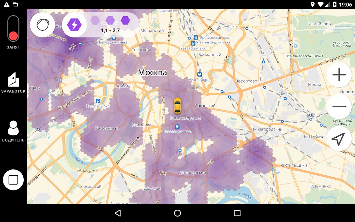 Таксометр покажет где самое большое скопление заказов, эти зоны будут помечены фиолетовым цветом. Стоимость заказа больше, чем обычно.