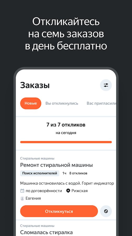 В приложении Яндекс.Услуги публикуется ежедневно более 10 тысяч новых заказов. Люди ежедневно нуждаются в услугах дизайнеров, айтишников, маркетологов и даже грузчиков. За один день вы можете откликнуться на не более чем 7 объявлений бесплатно. Чтобы исполнителем выбрали именно вас – постарайтесь откликнуться на объявление как можно быстрее. После того, как вас назначат исполнителем, вы можете общаться с заказчиком напрямую любым, удобным для вас, способом.
