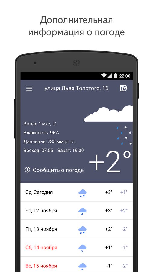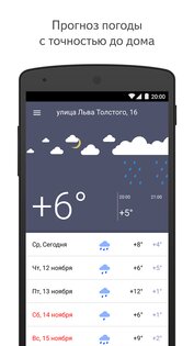 Яндекс Погода — это приложение покажет вам самые точные метеорологические данные. Вы сможете посмотреть погоду на сегодня, завтра и даже на целую неделю. Приложение точно определяет ваше местоположение и за счет этого показывает погоду вплоть до дома. Если вам нужно знать погоду не только там, где вы находитесь, но и еще где-нибудь, то вы можете добавить другие местоположения. За счет этого, вы сможете быстро переключаться между нужными прогнозами погоды.