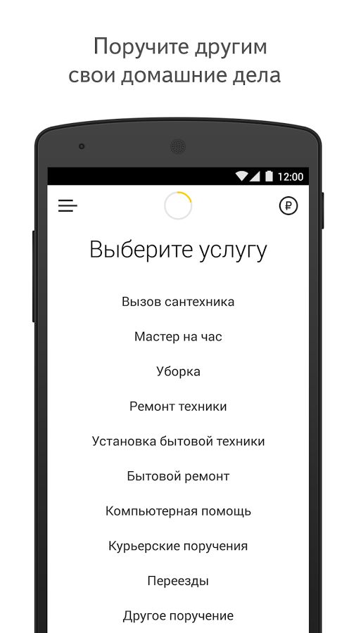 Типы услуг, доступные в приложении: курьерские поручения, переезды, уборка, компьютерная помощь, бытовой ремонт, ремонт и подключение техники.