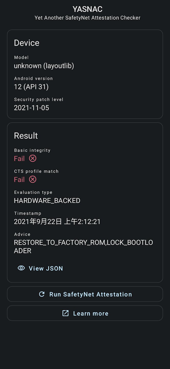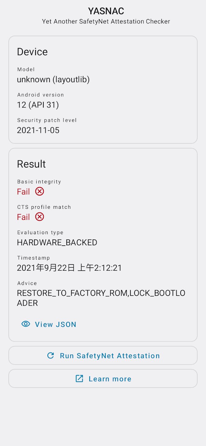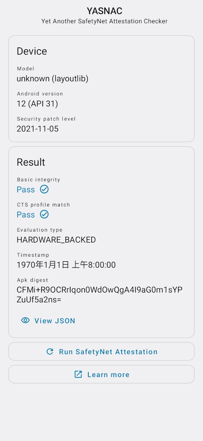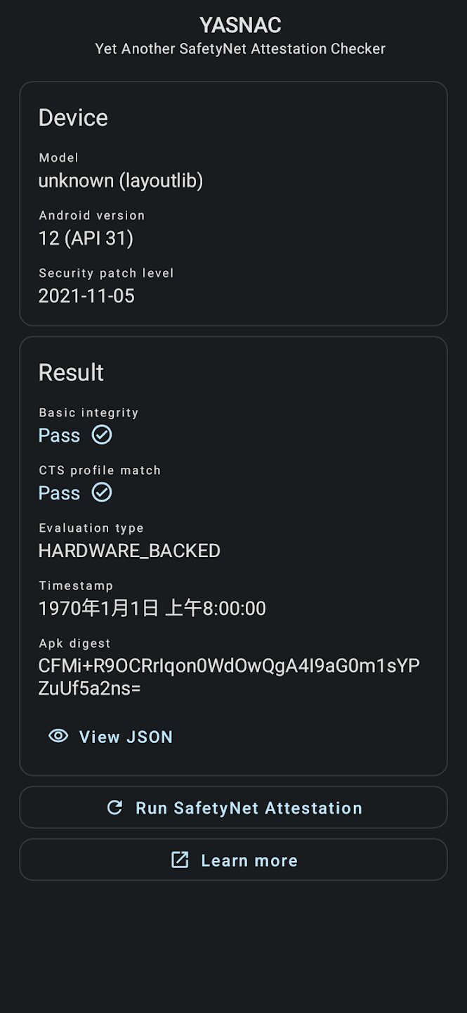 YASNAC — это специализированное приложение для Android, которое демонстрирует и проверяет совместимость устройства с API SafetyNet Attestation от Google. Этот инструмент предназначен для пользователей и разработчиков, которым необходимо проверить целостность и состояние безопасности своего устройства Android простым и понятным способом. Он предоставляет прямой интерфейс для проверки прохождения устройством важных проверок безопасности Google, которые необходимы для запуска определенных приложений, особенно связанных с банковскими операциями, платежами и безопасными услугами.
