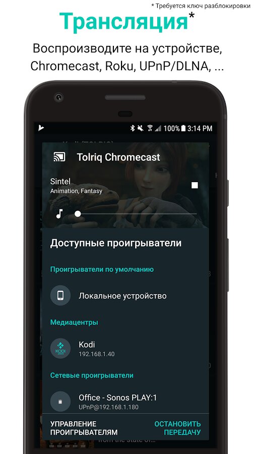 - Трансляция медиафайлов с телефона на Kodi, UPnP, AirPlay, Chromecast, Roku и Smart TV*