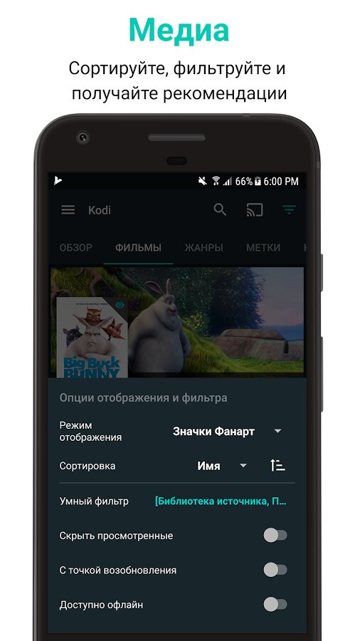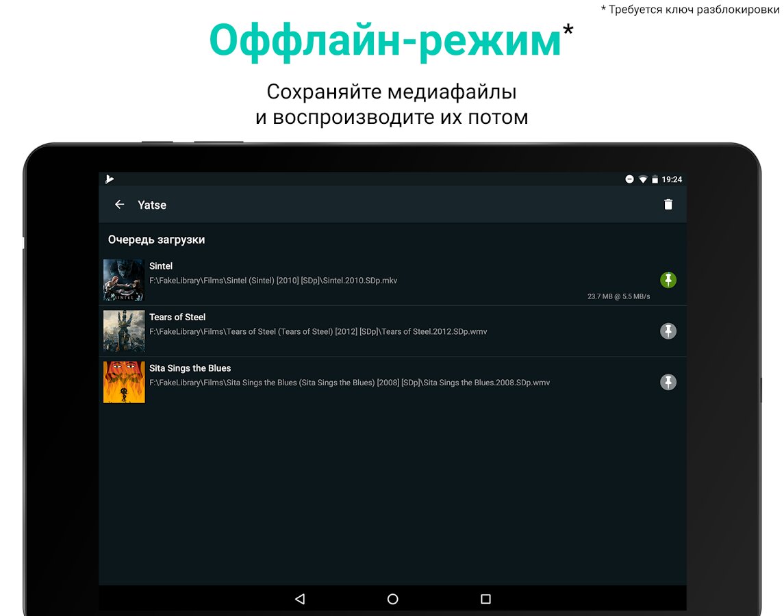 - Оффлайн-медиа* для синхронизации медиафайлов Kodi, Plex и Emby с Вашим устройством для воспроизведения оффлайн или трансляций