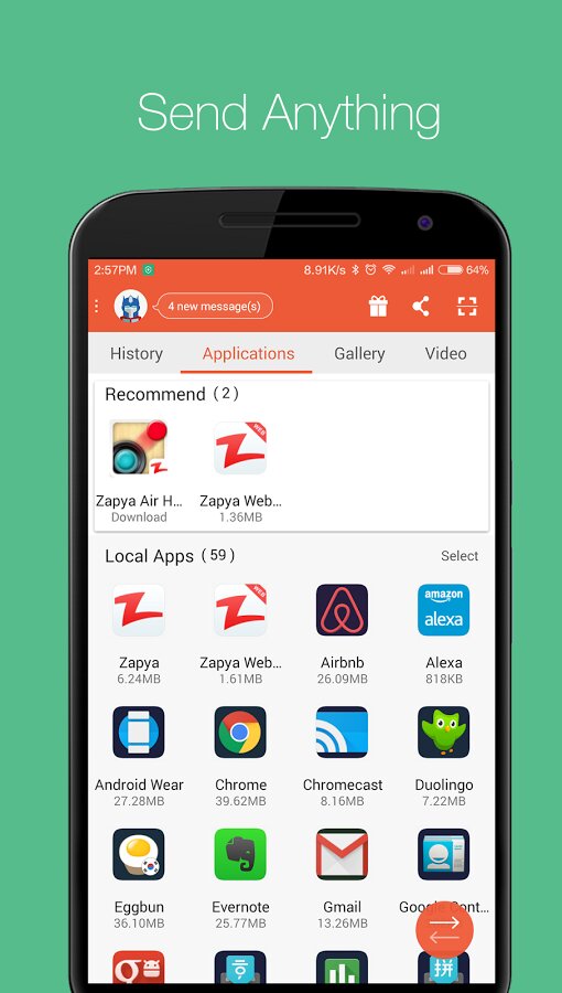 - Быстрая передача файлов: Zapya может передавать файлы со скоростью до 10 Мб/сек без использования интернет-соединения.