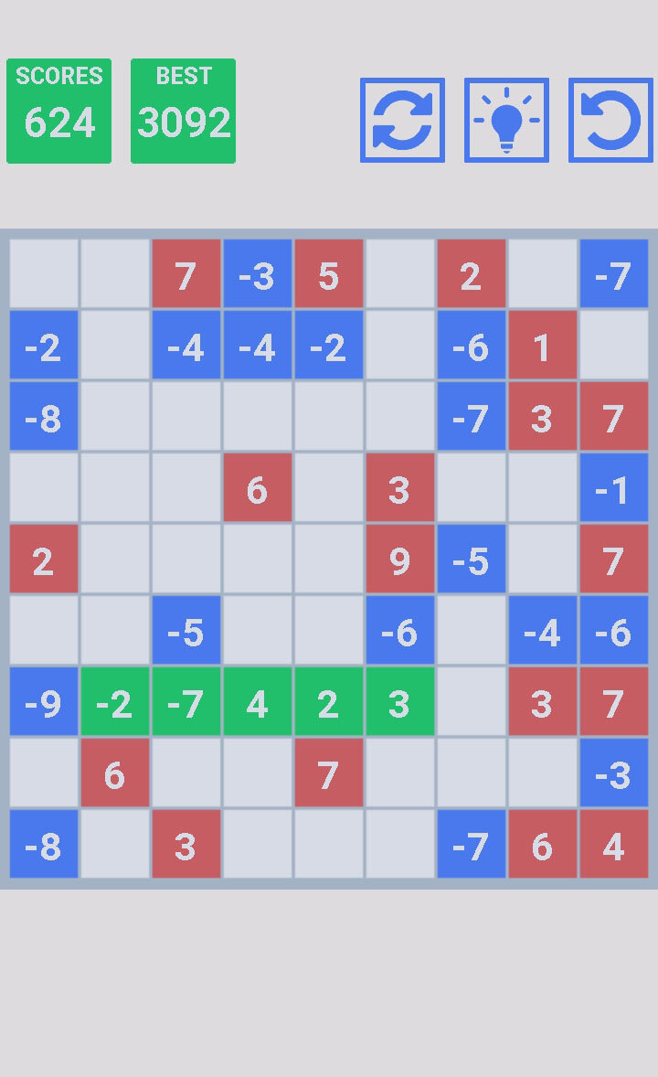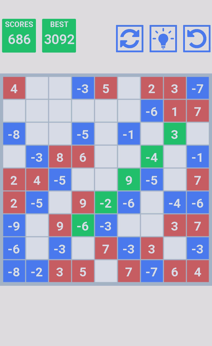 Цель игры: составлять линии из пяти или более цифр, сумма которых равна нулю. Для перемещения цифры нажмите на нее, затем нажмите на пустую клетку на поле, в которую Вы хотите ее переместить. Линии могут быть горизонтальными, вертикальными или диагональными. В игре есть возможность взять подсказку. Хорошая зарядка для мозгов. Тренируйте свой интеллект. Игра для всей семьи.