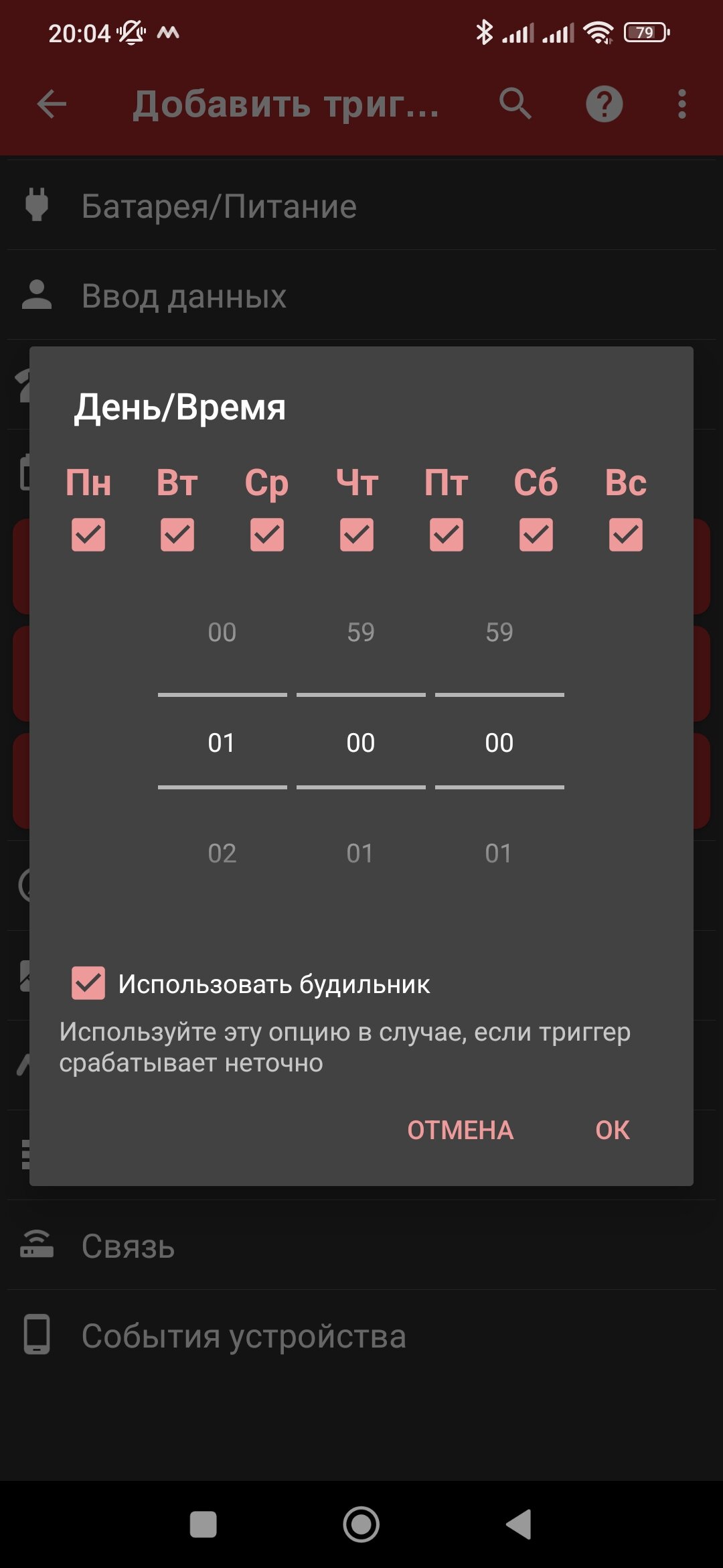 - «Триггеры» → иконка «+» → «Дата/Время» → «Дата/Время» → проставьте галочки на все дни и поставьте время «01:00».