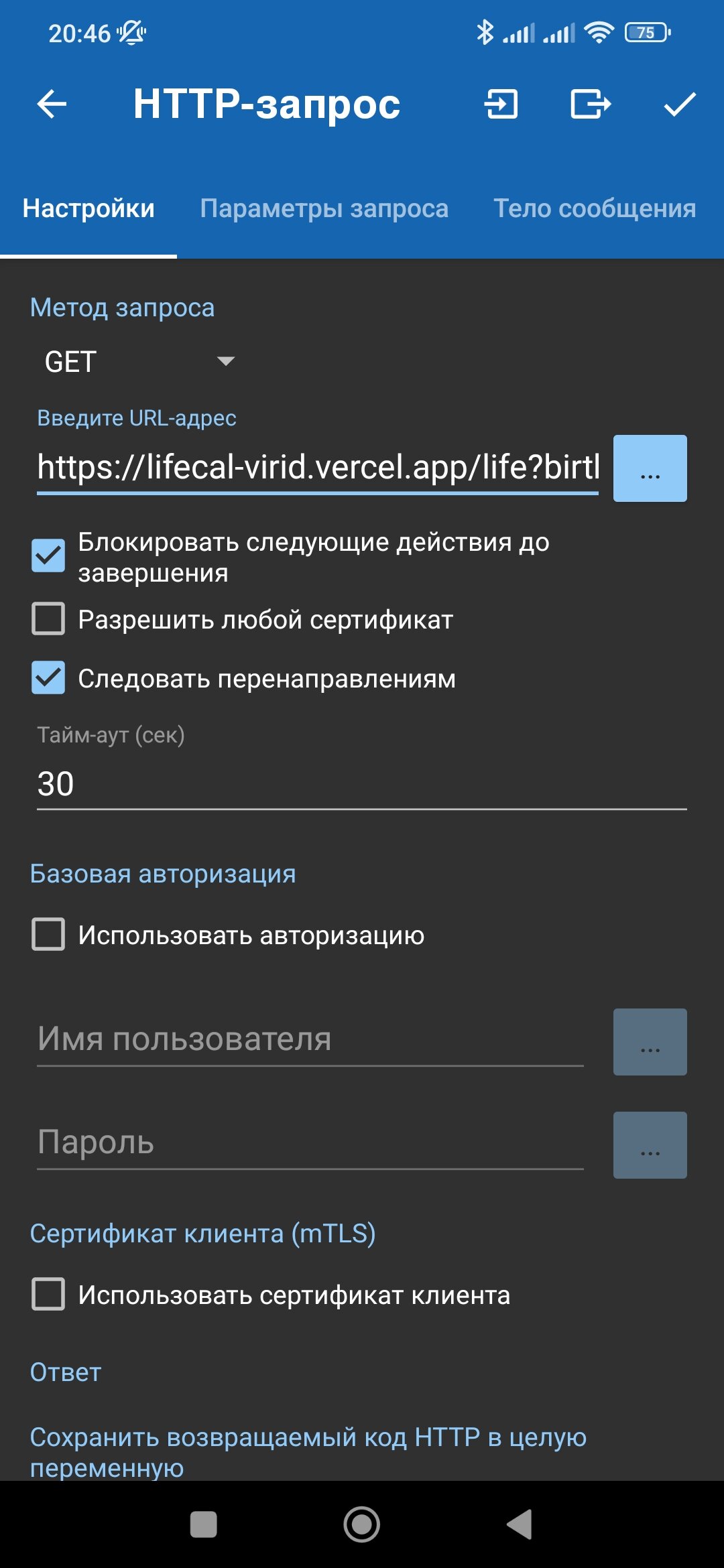 - В блоке «Действия» нажмите на «+» → «Взаимодействие с сетью» → «HTTP-запрос» → скопируйте ссылку из поля в 4 пункте на сайте The Life Calendar и вставьте эту ссылку в соответствующее поле MacroDroid.