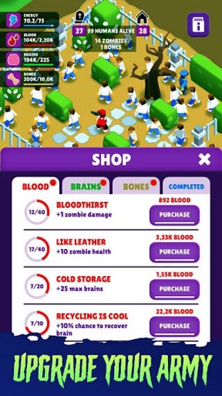 - Используйте собранные материалы, чтобы сделать своих зомби сильнее и быстрее;