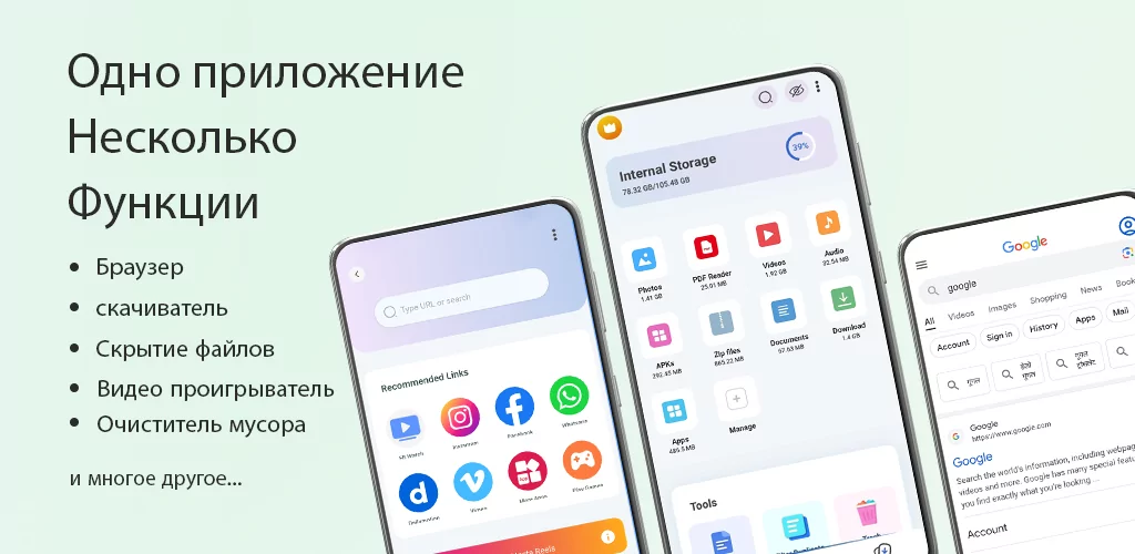 Приложение включает встроенный веб-браузер, позволяющий просматривать любой онлайн-контент и легко сохранять фотографии, видео или другие файлы прямо на вашем устройстве. Оно оптимизирует производительность благодаря быстрой скорости загрузки и предлагает темный режим для удобного просмотра. Дополнительные основные функции — это расширенная утилита для очистки ненужных файлов, быстрый поиск файлов, легкий доступ к недавно открытым файлам и возможность добавлять избранные элементы в закладки или скрывать личные фотографии и видео для дополнительной безопасности.