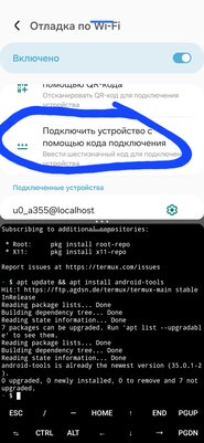 4. В режиме разделенного экрана наверху экрана открываем намтроки, внизу термукс. В настройках тапаем по подключить устройство с помощью кода